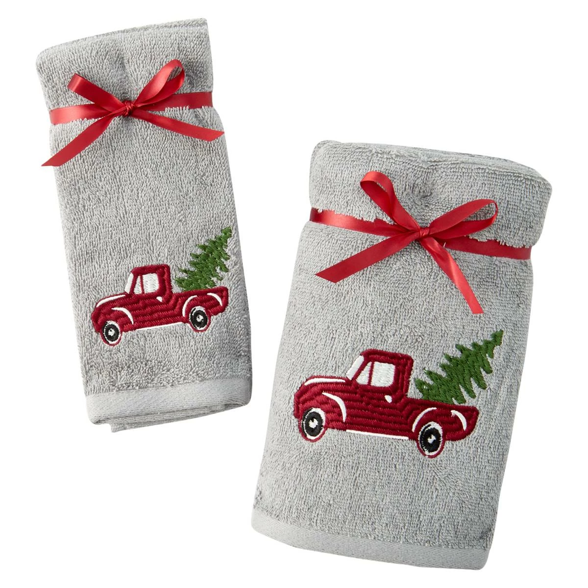 The Avanti Christmas truck 2-pack hand/fingertip towels feature a red pickup truck and whimsical Christmas trees embroidered on 100% Cotton velour towels.
