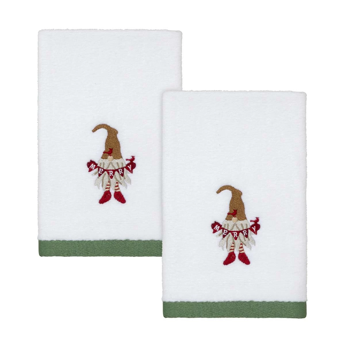 The Avanti Merry Gnome decorative 2-pack of fingertip towels features an embroidered festive gnome dressed in a holiday hat, pants, and shoes holding a banner that says “Merry”.