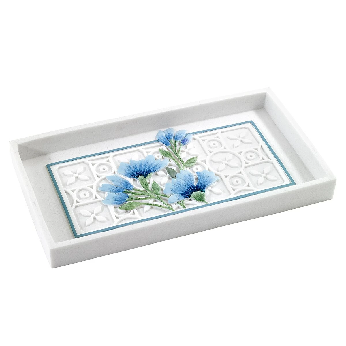 The Avanti Garden View tray features a group of fresh spring blossoms in various shades of blue with green leaves and stems on a white debossed trellis design framed with a medium blue border. Realistically created in hand-painted resin.