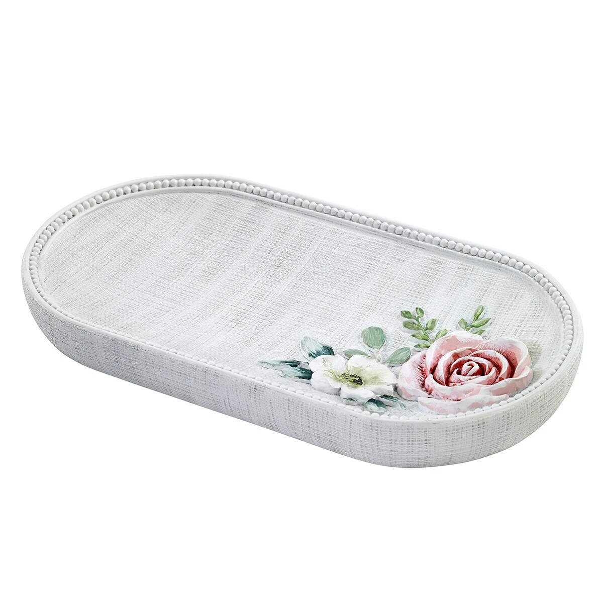 The Avanti Spring Garden tray is beautifully decorated with embossed dimensional peonies in pink and white with green leaves on an off-white textured background and crown molding detail around the top. Made of durable hand-painted resin.