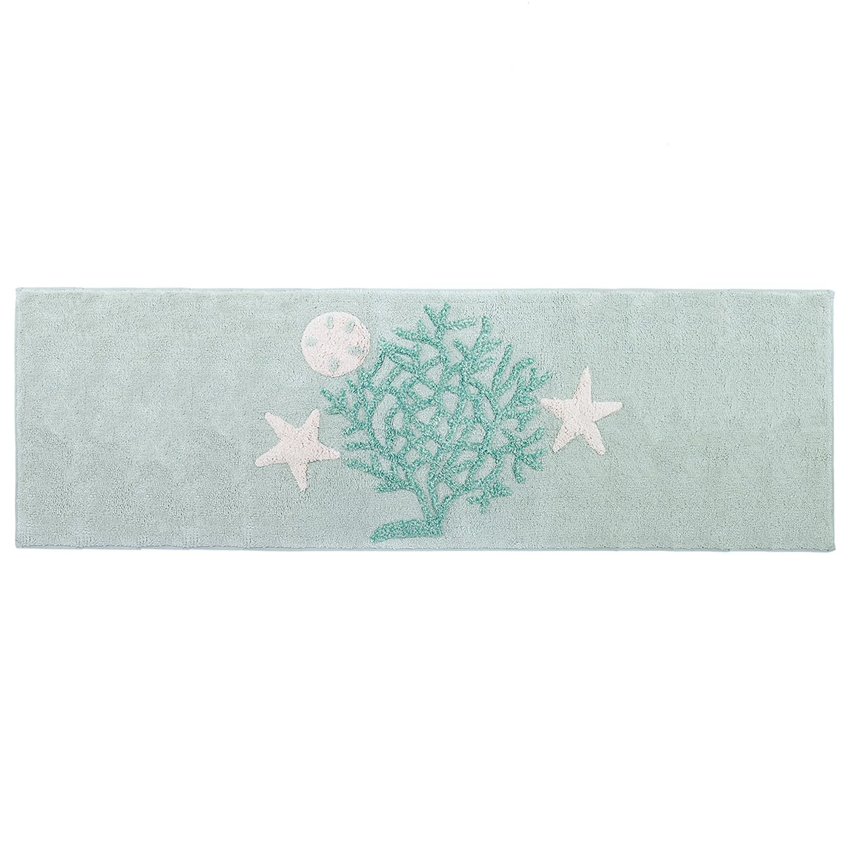 This Avanti beachcomber rug features a seascape design with a coral ivory starfish and shell on an aqua background. This oversized rug is skid resistant and machine washable.Size: 24×60.