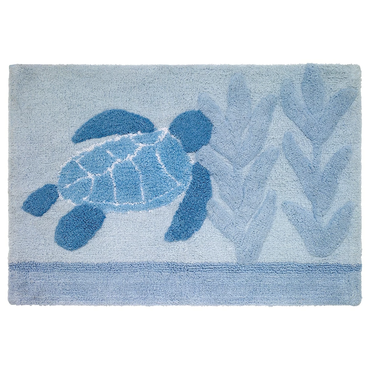 This Avanti Caicos rug will be a great addition to your coastal bathroom decor. It features a large sea turtle swimming among the seagrass in various shades of blue.