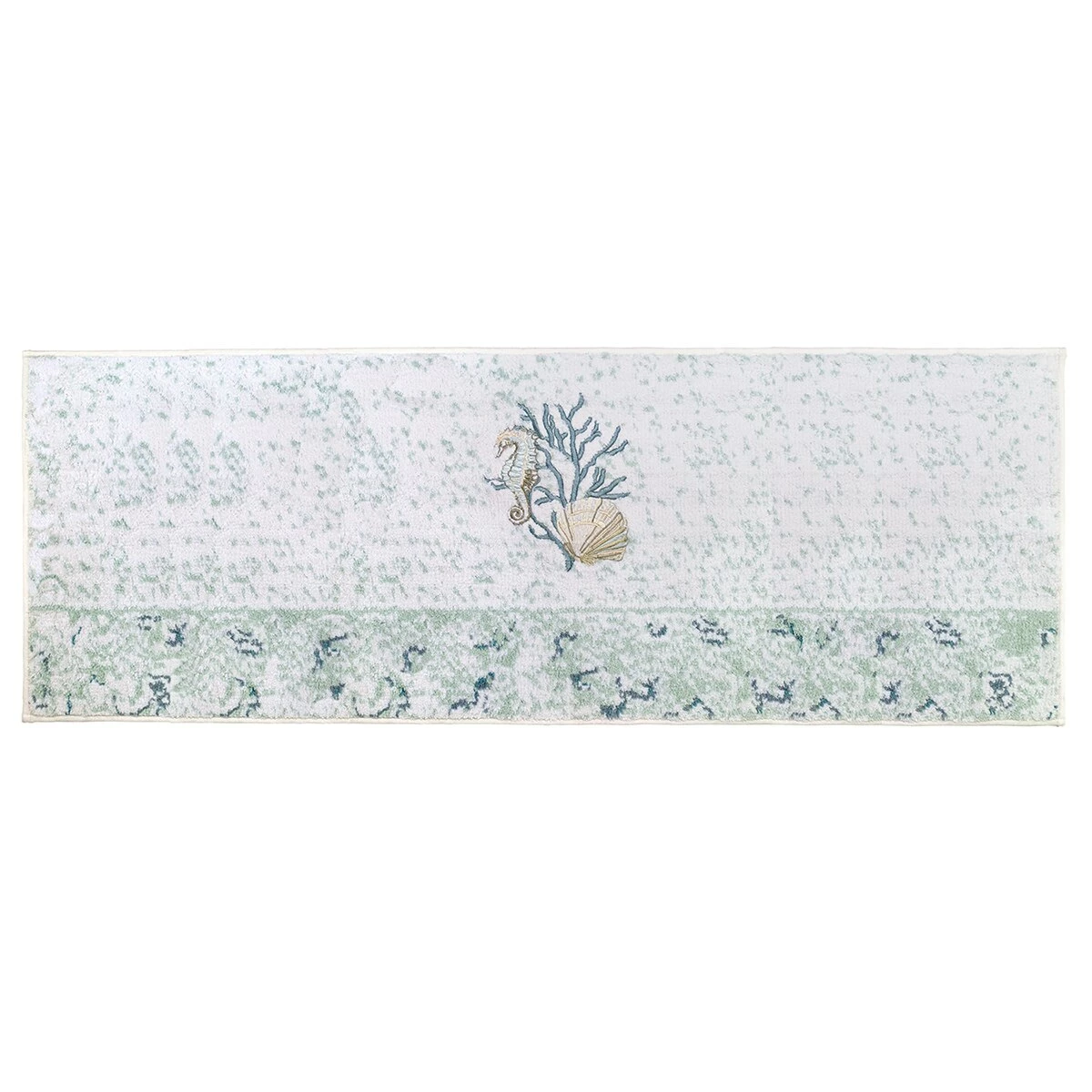 This Avanti Coastal Terrazzo rug is tufted in 100% cotton and embroidered with a nautilus and starfish. The rug has a white center and aqua border top and bottom. This oversized rug is both skid resistant and machine washable.Size: 24×60.