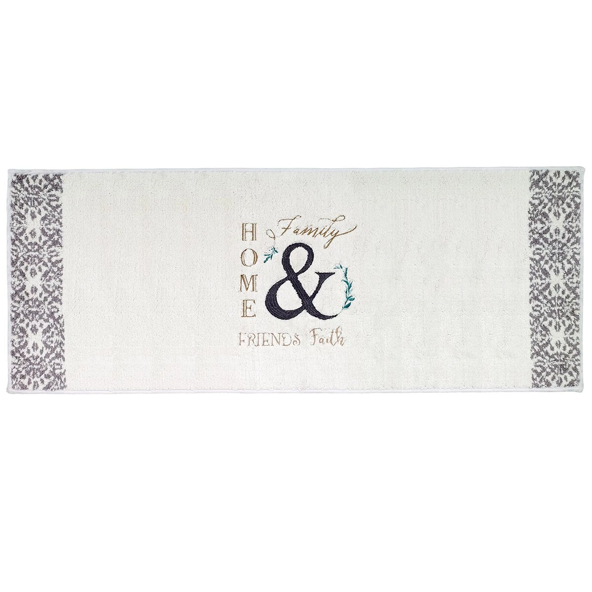 This Avanti modern farmhouse rug is tufted in 100% cotton with embroidered icons and words finished with floor tile borders on each side. It will invite a relaxing rustic style dΓ©cor and a welcoming touch. This oversized rug is skid resistant and machine washable.Size: 24×60.