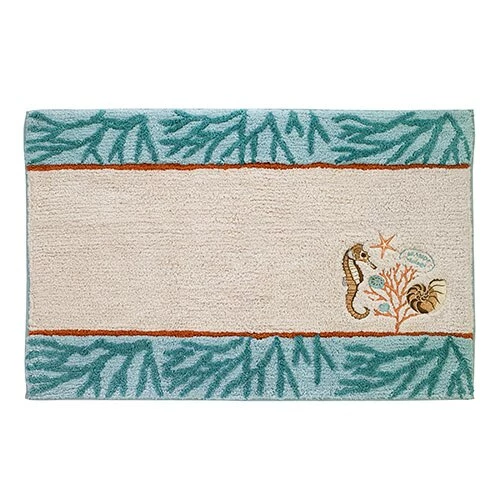 The Avanti Seaside Vintage bath rug has a variety of sea creatures embroidered tufted rug, adding a touch of the sea to any bathroom. 100% Cotton. Machine wash warm tumble dry low. Size 20 x 30.