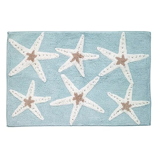With white starfish on aqua ground tufted in cotton, the Avanti Sequin Shells Rug brings a touch of the sea to any bathroom or kitchen. Non-skid back.
