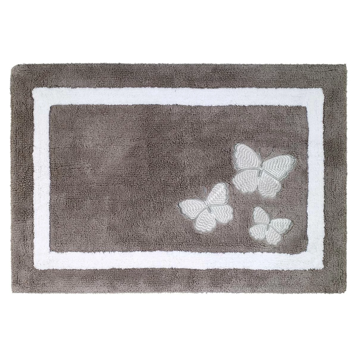 The Avanti Yara rug features a beautifully embroidered white butterfly with grey accents on a grey base with a white border.