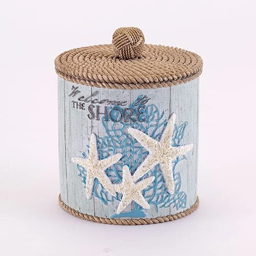 This Avanti Beachcomber bathroom covered jar is crafted in resin for incredible detail. The coral and starfish motif is set off beautifully on an aqua clapboard background and finished with a rope detail on the bottom and a rope cover. Wipe with a damp cloth to clean. Dimensions: 5.5โH x 4.33โW x 4.33โD.