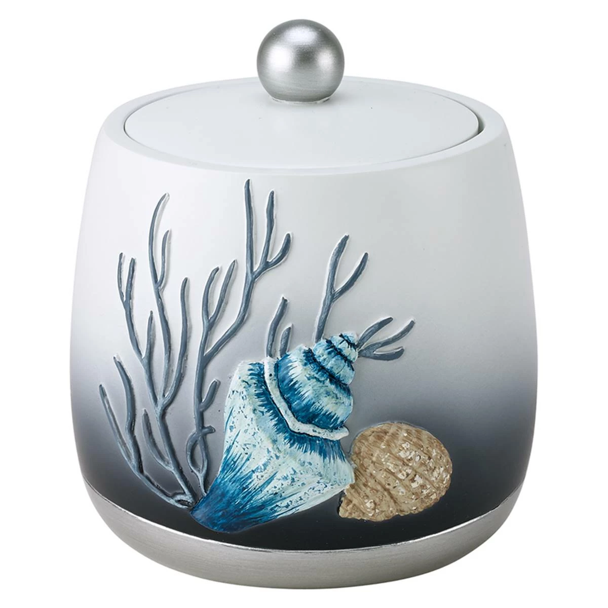 The Avanti Blue Lagoon jar is decorated with raised starfish, shells, and coral in shades of blue and beige on an ombre base of off-white to dark blue and a silver border on the bottom. The cover is topped with a starfish for easy removal.