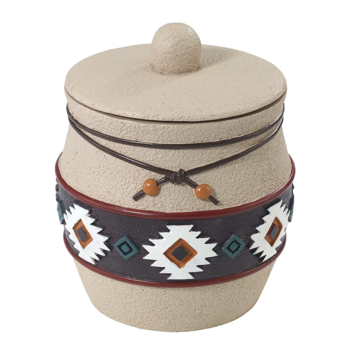 Bring a unique look to your bathroom dΓ©cor with this Avanti Navajo dance jar. Features southwest symbols in teal, brown, orange, and brick borders on a beige textured ground. The top of the base is decorated with brown rope detail.