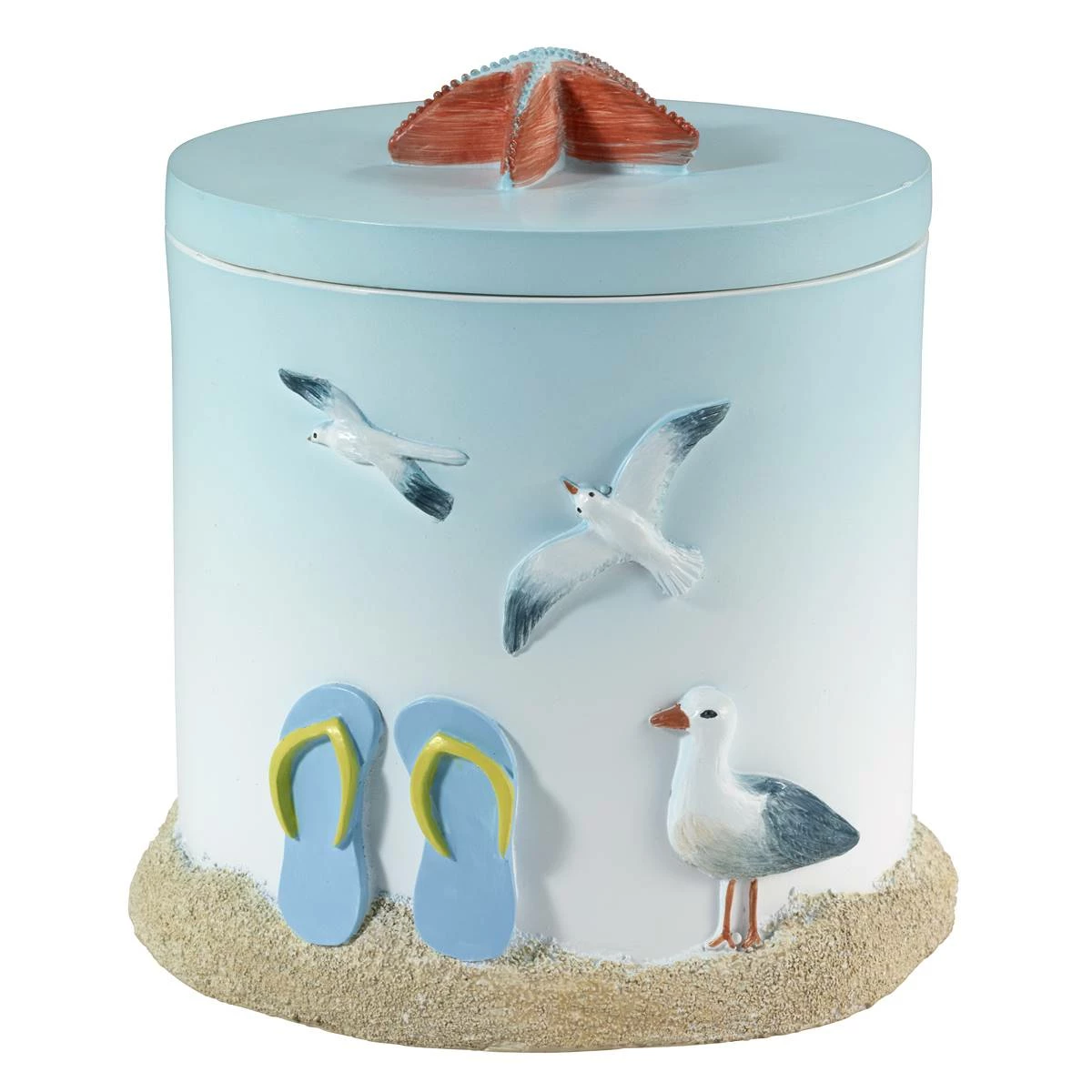 Bring some fun to the bathroom with the Avanti Surf Time Jar. Features a white-to-sky blue ombre ground with dimensional seagulls, flip-flops, and starfish.