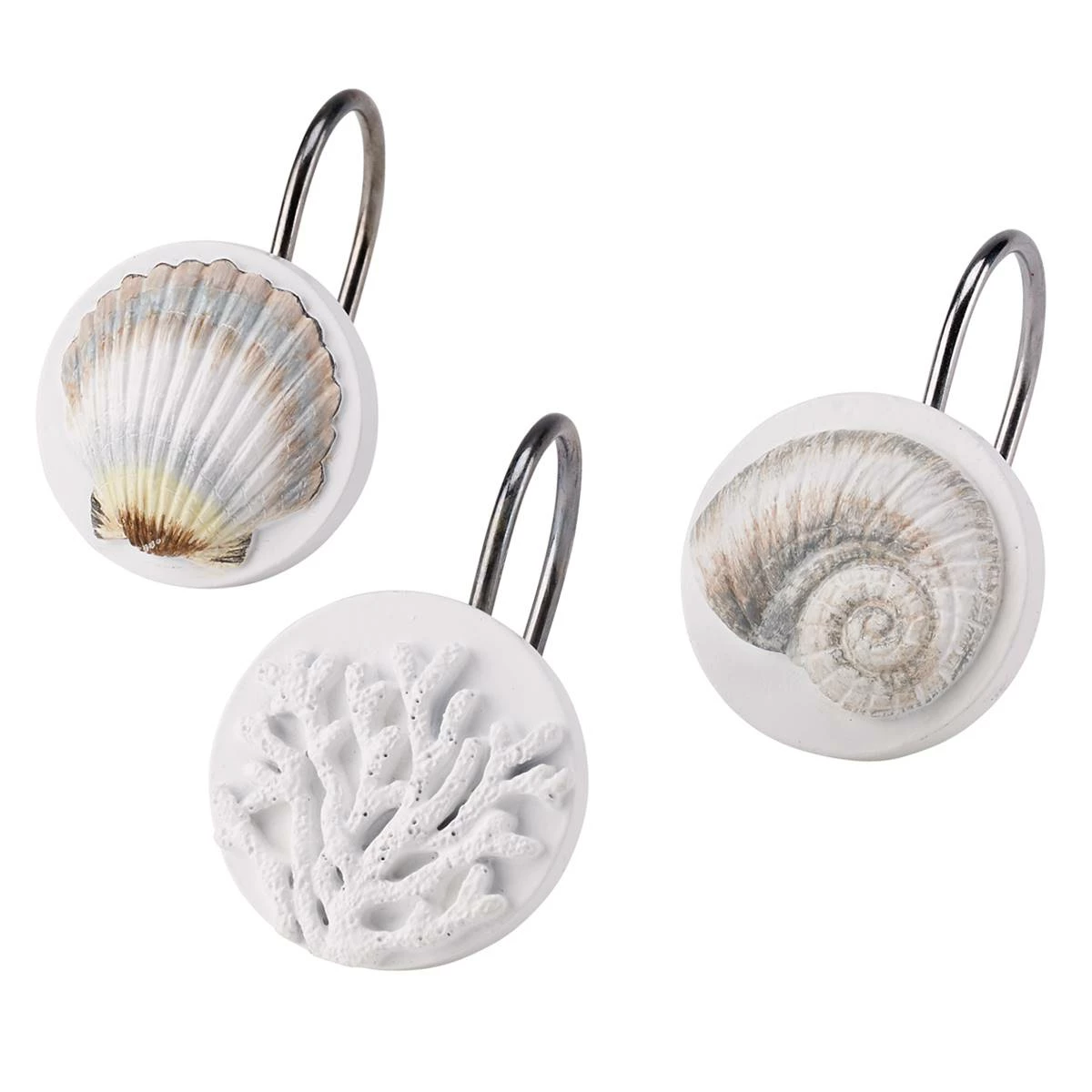 The Avanti Destin Shower Curtain Hooks features a series of 3 hand-painted icons pulled from the bath collection: fan shell, nautilus and coral. This set of 12 comes with 4 of each design and is the perfect accent to any bathroom.