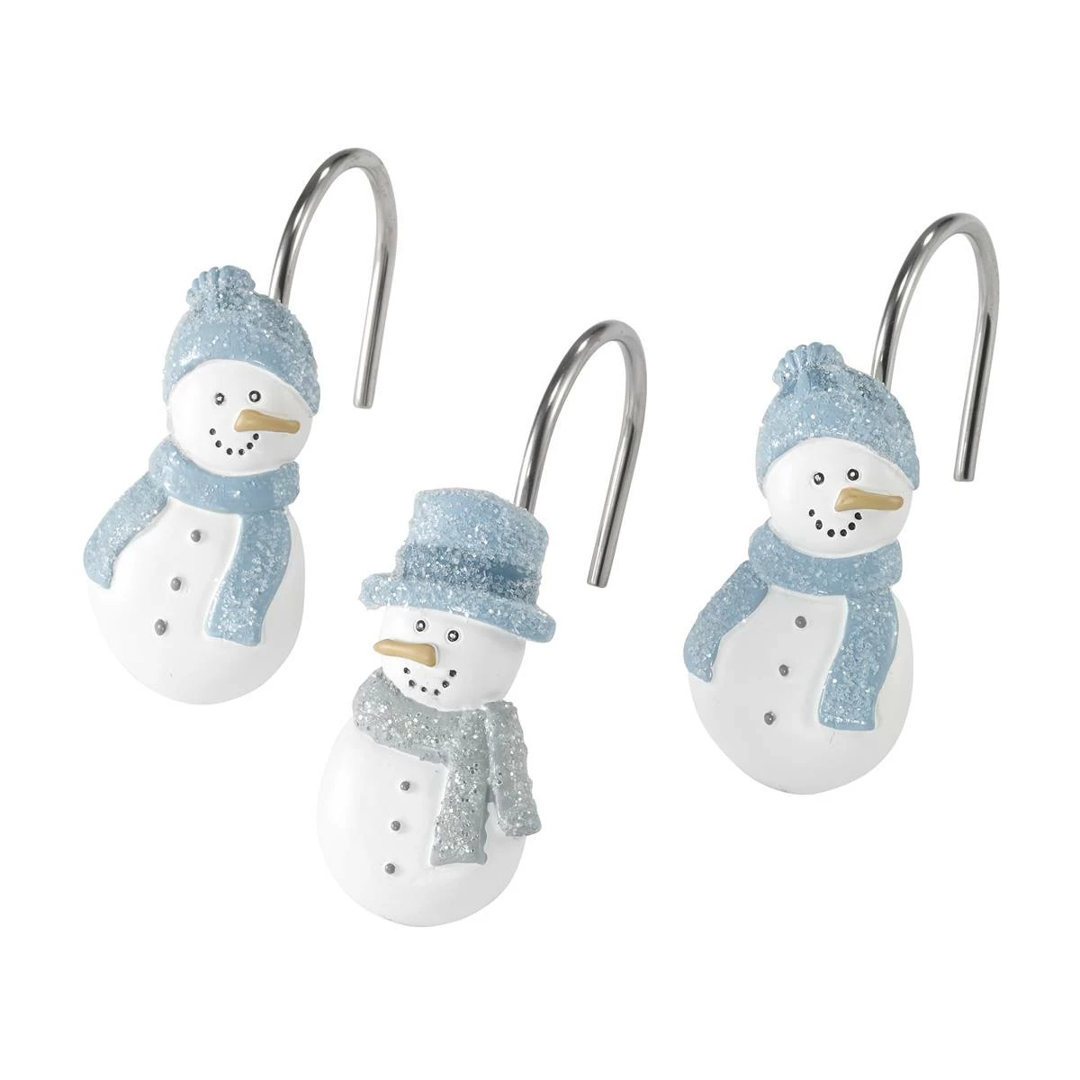 The Avanti Frosty Friends Shower Curtain Hook Set features 2 snowmen both in blue hats and one with a grey scarf and the other with blue on white bodies. Made of durable, hand-painted resin for long life and easy care. The set includes 12 hooks, 6 of each of the two designs.