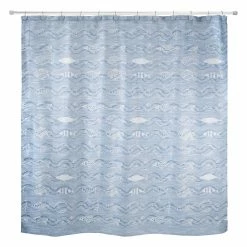 Bring a touch of fun into your bathroom dΓ©cor with this Avanti Blue Fin Bay Shower Curtain. It is decorated with an all-over primitive-looking printed fish design. The white fish is silhouetted on a light blue textured ground with dark blue waves.