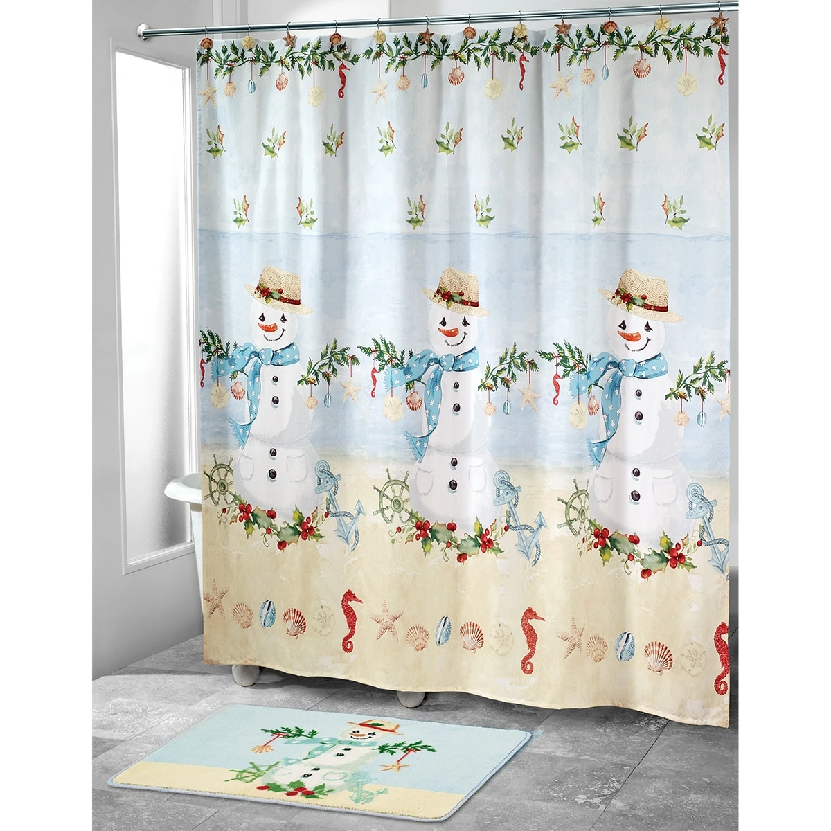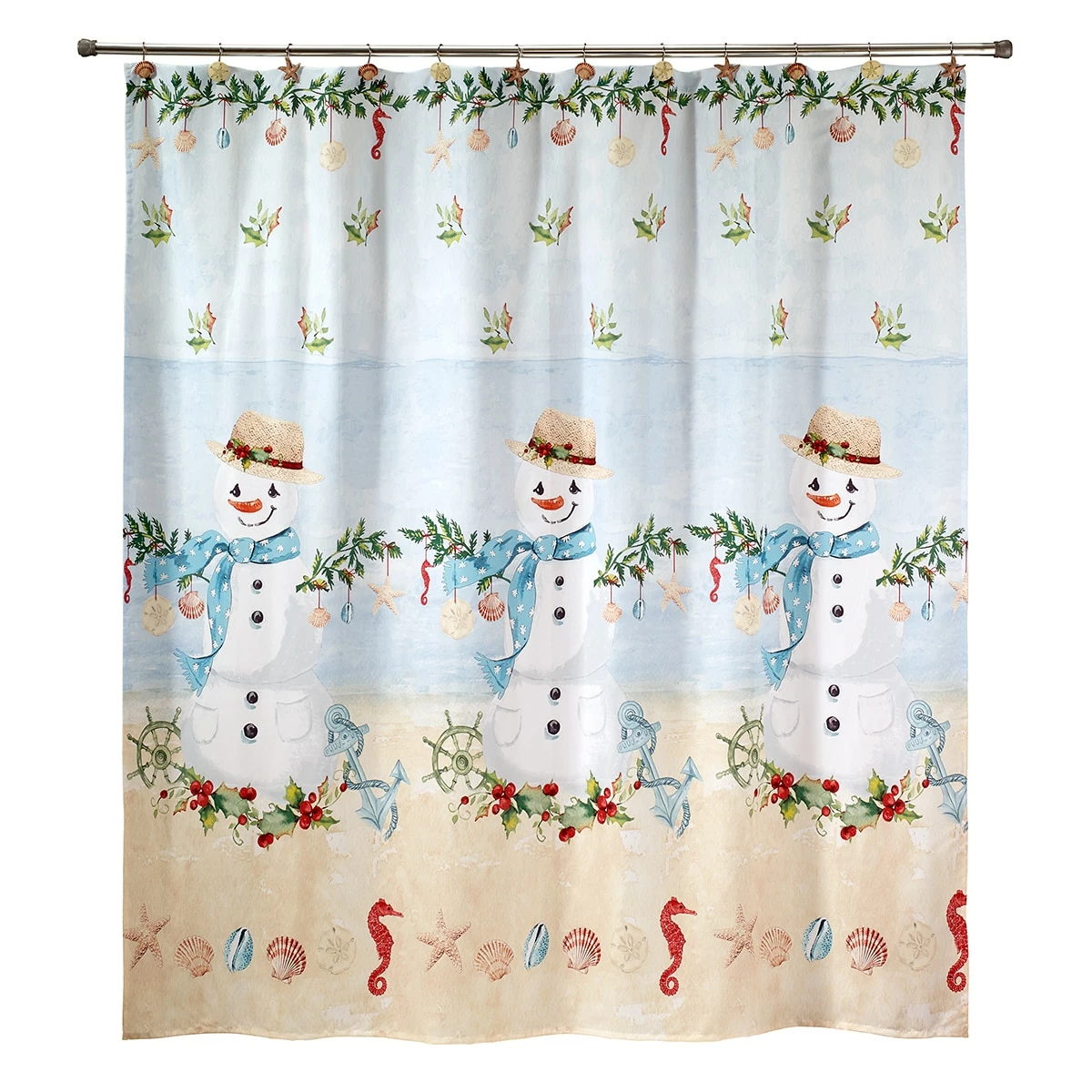 The Avanti Coastal Snowman shower curtain features 3 smiling snowmen with straw hats, blue polka-dotted scarves, and holly with seashells, a starfish, and a ship’s wheel. A line of colorful seahorses and shells border the bottom and the background starts with beige sand at the bottom and goes into sea blue and then sky blue at the top.