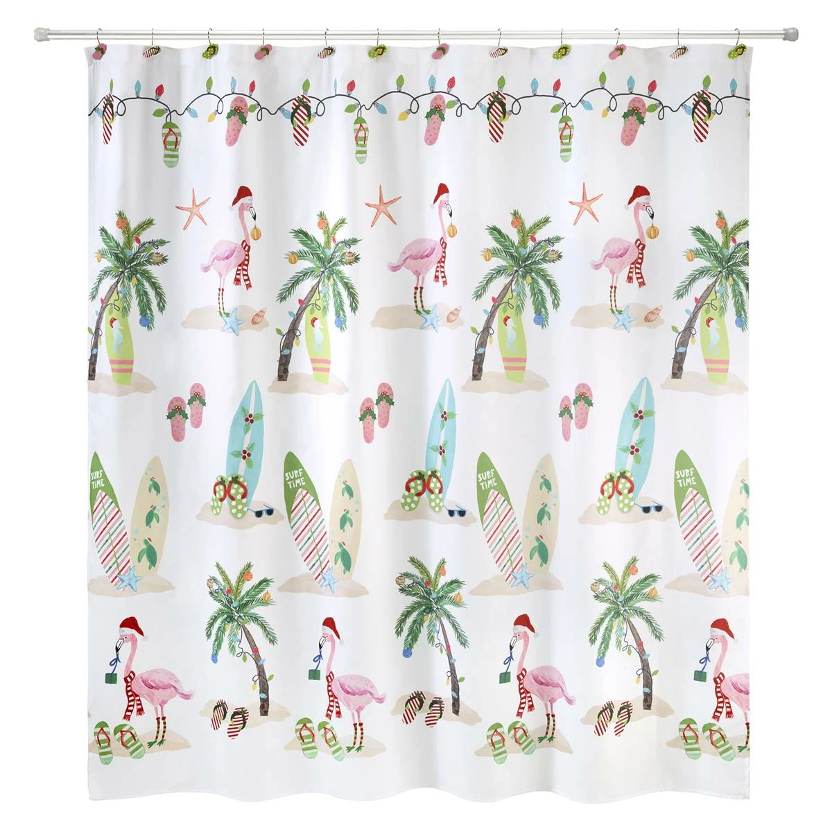 The Avanti Flamingo Jingle Shower Curtain features beautifully printed holiday and coastal icons including flamingos, palm trees, surfboards, and flip-flops in festive colors on a white ground. The top is bordered by a string of holiday lights and flip-flops.