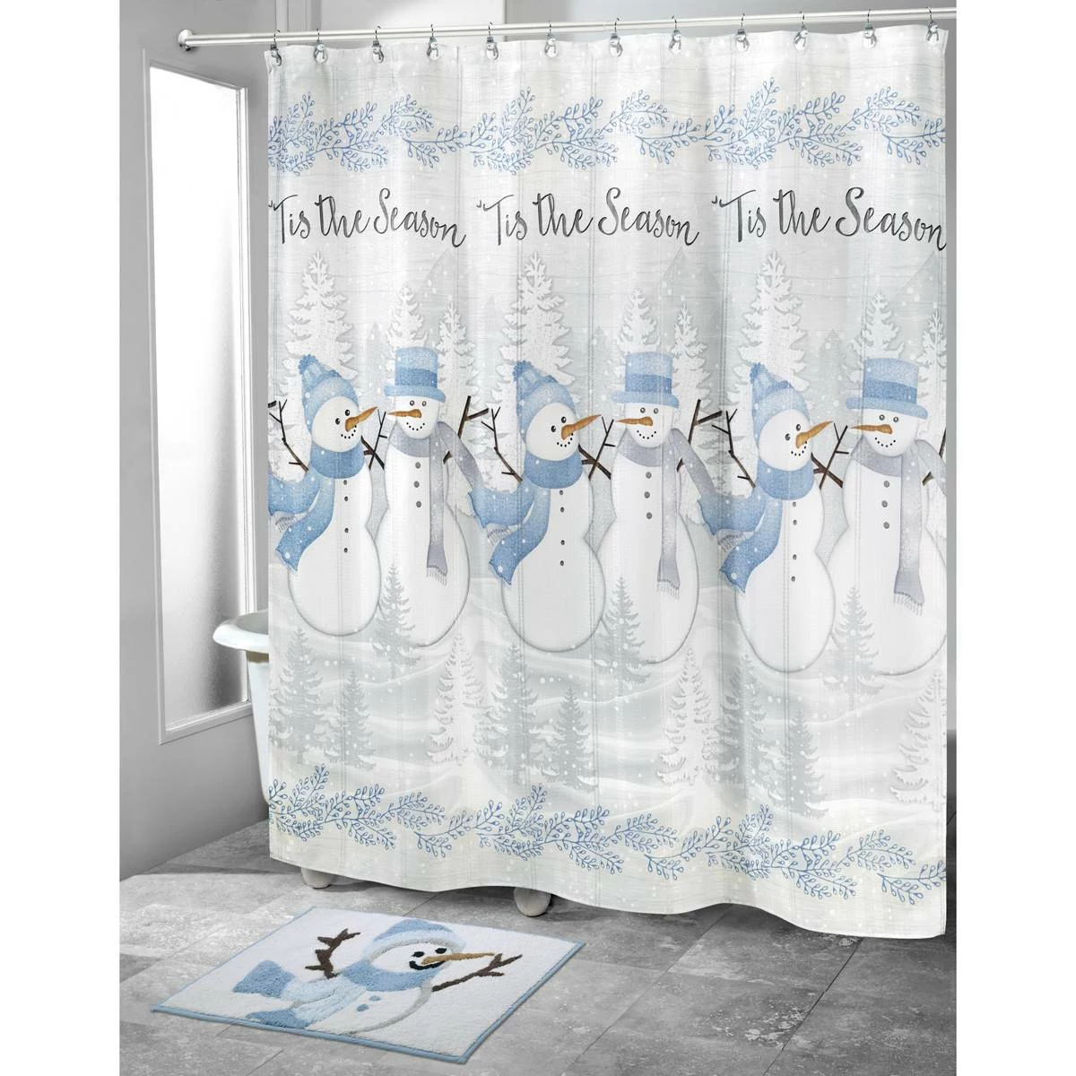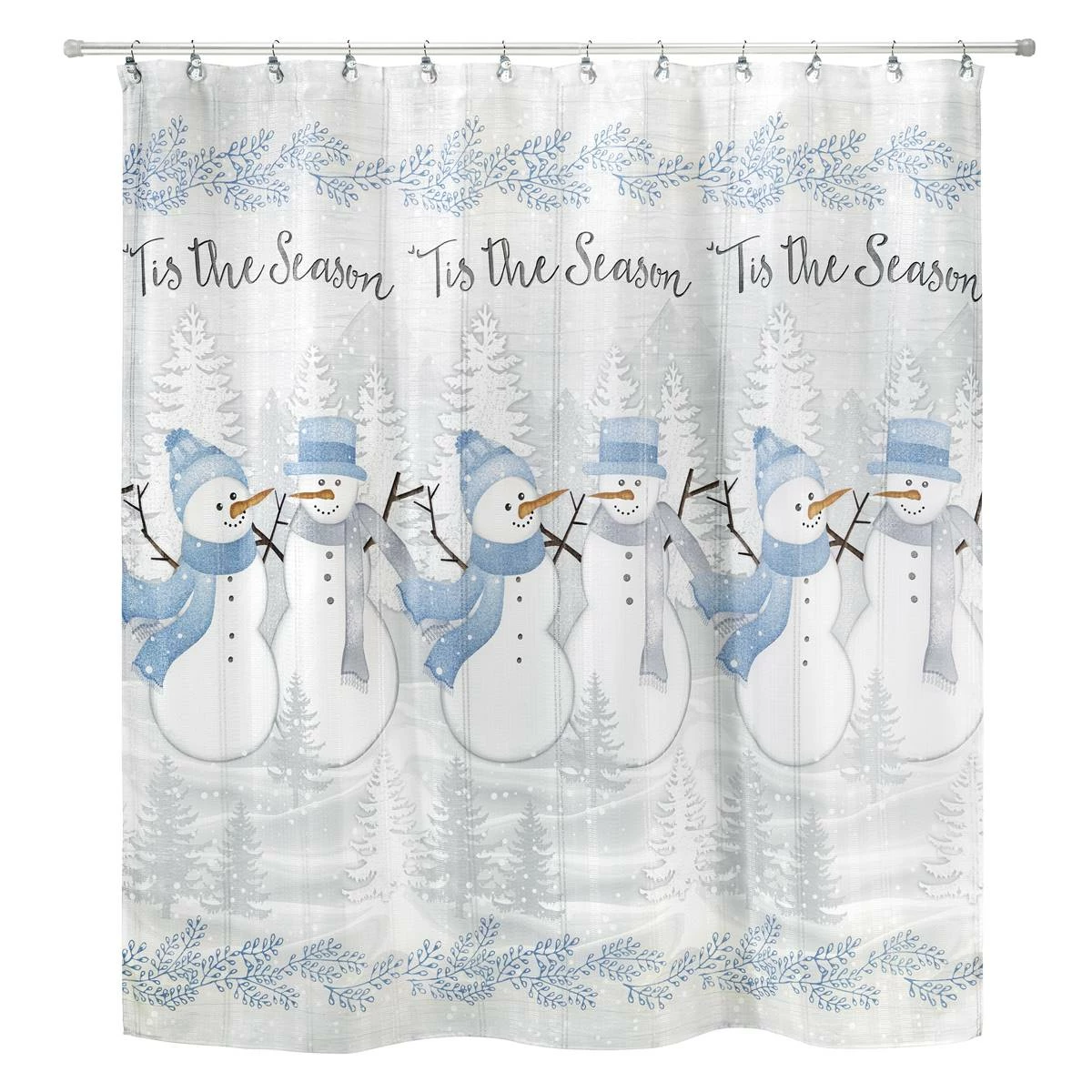 The Avanti Frosty Friends Shower Curtain is a beautifully printed winter scene with pairs of snowmen with hats and scarves, grey and silhouetted white pine trees, and “‘Tis the Season” across the top on an off-white ground. Grey branches form a border at the top and bottom.