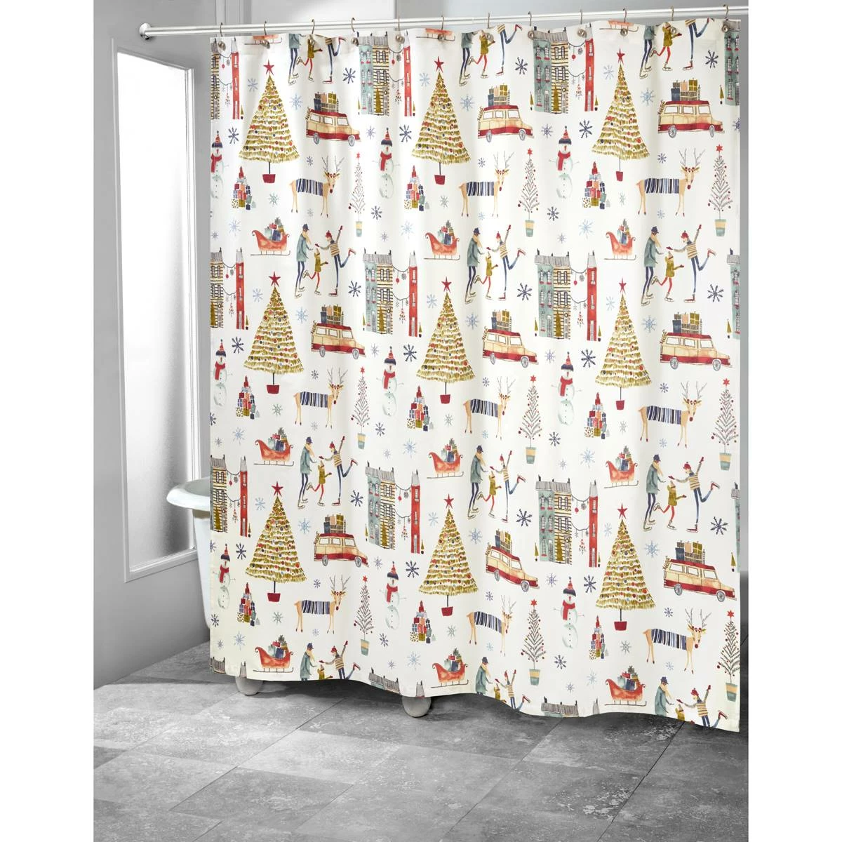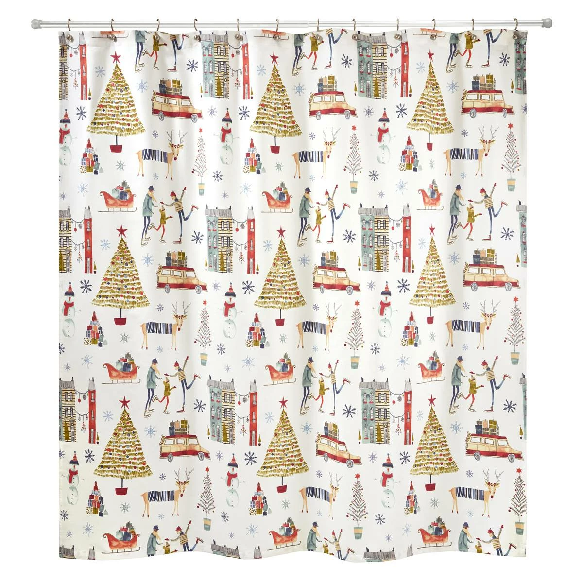 The Avanti holiday town shower curtain depicts a festive, colorful collection of holiday icons and scenes including a Christmas tree, snowman, station wagon, sleigh, skaters, snowman, and reindeer.
