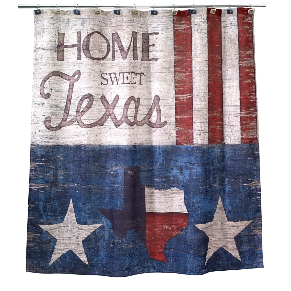The Avanti Home Sweet Texas Shower Curtain features “Home Sweet Texas”, the Texas state flag, and stars and stripes on a distressed ground. This curtain will become a great addition to your bathroom.