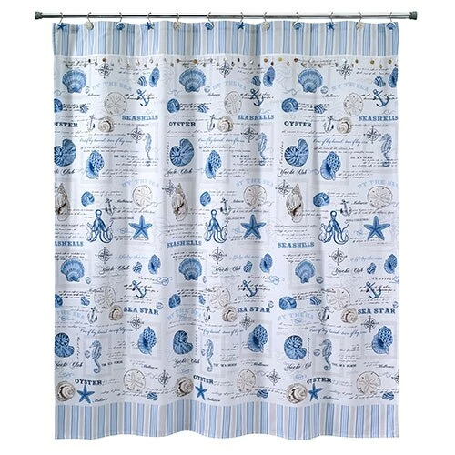 The Avanti Island View shower curtain features a beautifully printed design with sea creatures, words and a coordinating vertical stripe top and bottom making you feel like you are the beach every day! 100% Polyester. Machine wash warm and tumble dry low. Size 72 x 72.