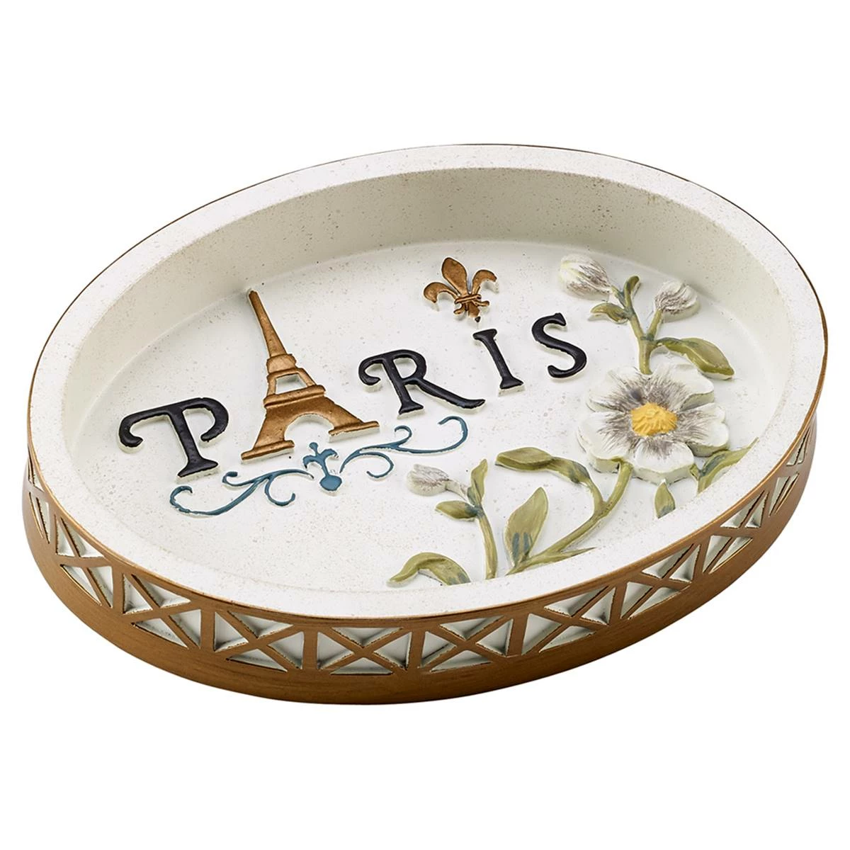 The Avanti Paris Botanique Soap Dish features the word “Paris” in grey with an Eiffel Tower and flowers in neutral shades on an off-white base. The bottom is bordered with a gold grid pulled from the Eiffel Tower.