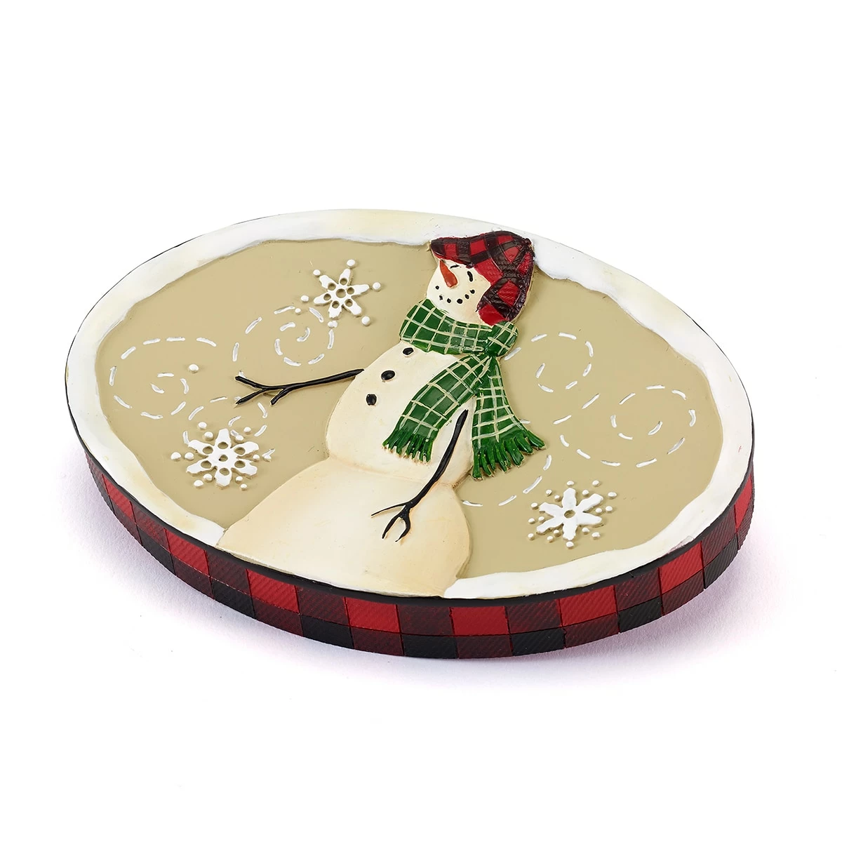 The Avanti Snowmen Gathering soap dish features a raised snowman with snowflakes on a beige background with a red and black plaid border. Beautifully detailed in hand-painted resin.