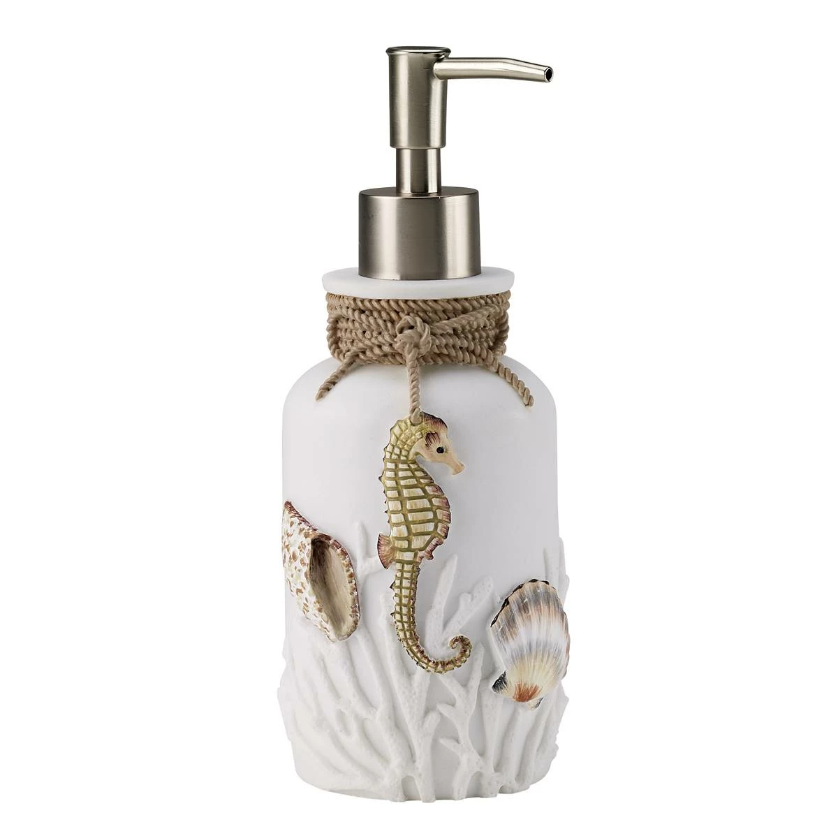 The Avanti Destin Lotion Dispenser features an intricately hand-painted, detailed coral reef along the bottom with shells and a seahorse throughout the coral on a white ground. The rope design along the neck of the pump brings the design to life and will make this piece a great addition to any bathroom.