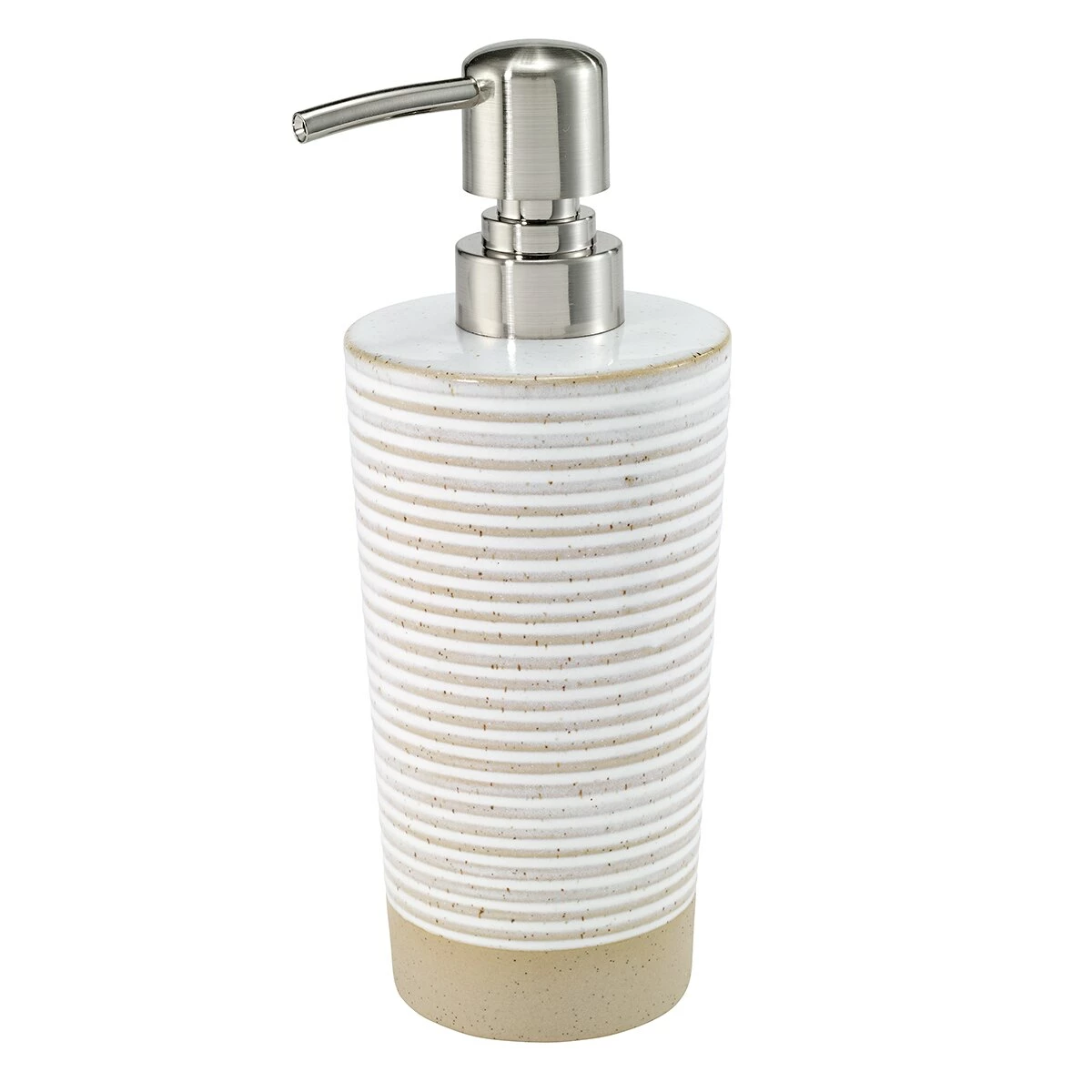 The Avanti Drift Lotion, Soap, and Sanitizer Dispenser feature a textured ribbed look with alternating glossy white and linen lines on the body with a solid linen-textured matte base. Made out of sand-clay with white glaze.
