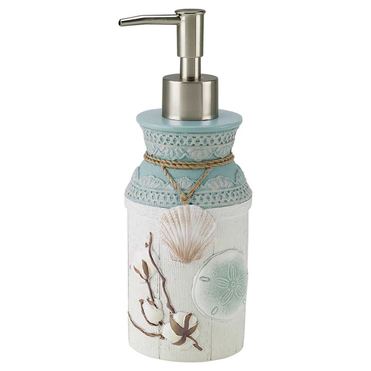 The Avanti Farmhouse Shell lotion dispenser features a sand dollar, cotton on the vine with a fan shell medallion hanging on a rope. The background is textured, off-white shiplap with blue lace border on top.