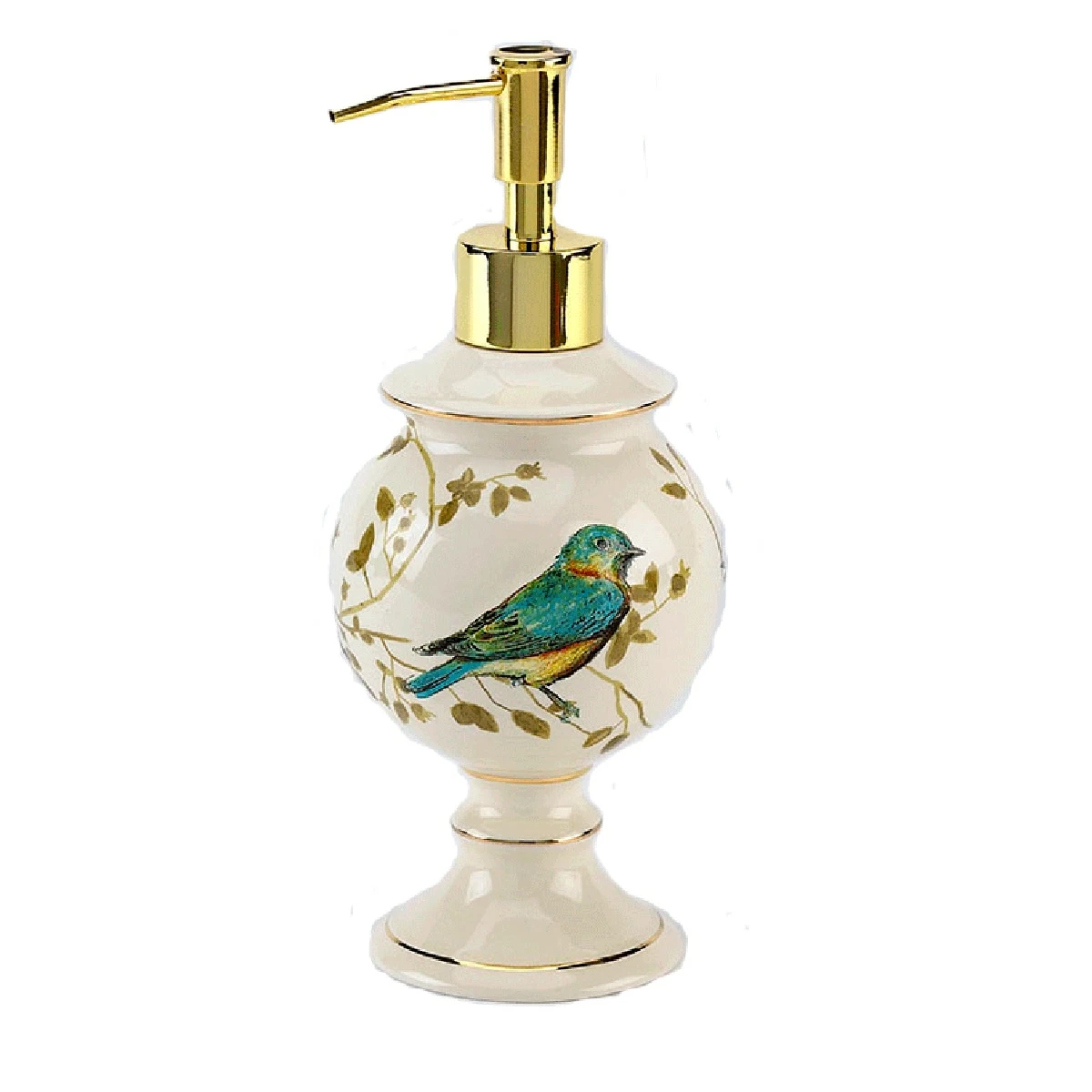 Ceramic lotion pump features birds on a ivory background and gold-tone accents.