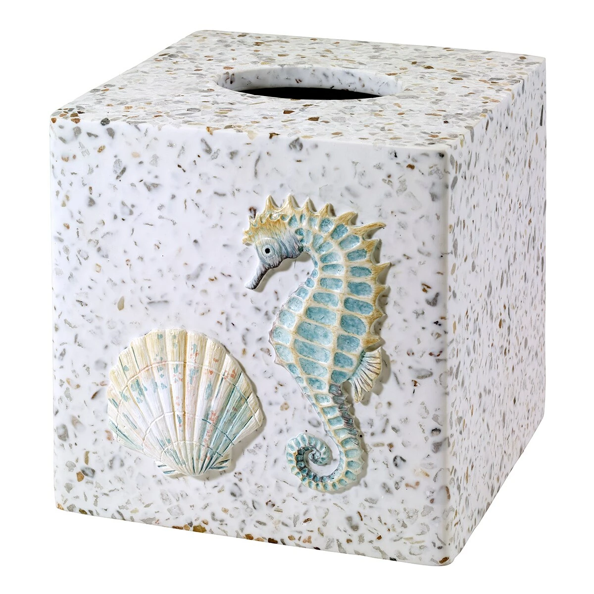 Add this Avanti Coastal Terrazzo tissue cover to your bathroom collection. It is made of resin combined with chips of multi-colored stones for the base with a seahorse, fan shell, and coral added in hand-painted relief.