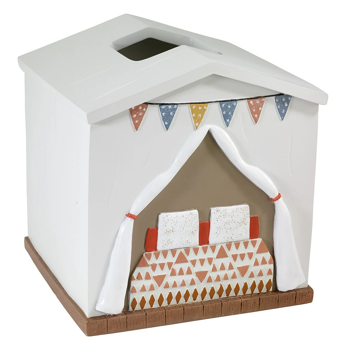 The Avanti Gone Glamping tissue cover is a recreation of a glamping tent in shades of ivory, beige, and red featuring all the comforts of home. Created in hand-painted resin with incredible detail.