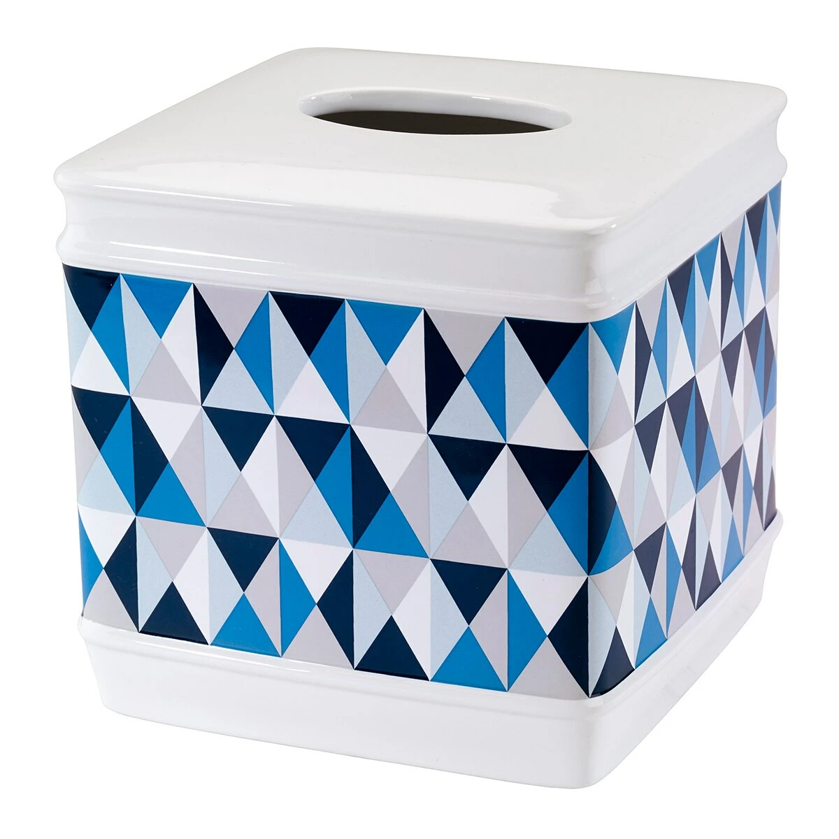 Add this Avanti Now House by Jonathan Adler Bleecker tissue cover to your bathroom collection. It is decorated with a triangle design decal in shades of blue, grey, and white on a white ceramic body.