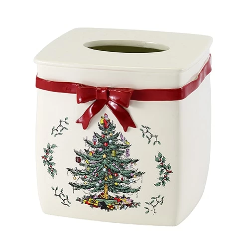 This Avanti Spode Christmas tree red bow tissue cover features the iconic Christmas tree on a white base with a red ribbon tied around the top. Made with Resin. Wipe with a soft cloth to clean. Dimensions: 6.1”H x 6.1”W x 6.1”D.