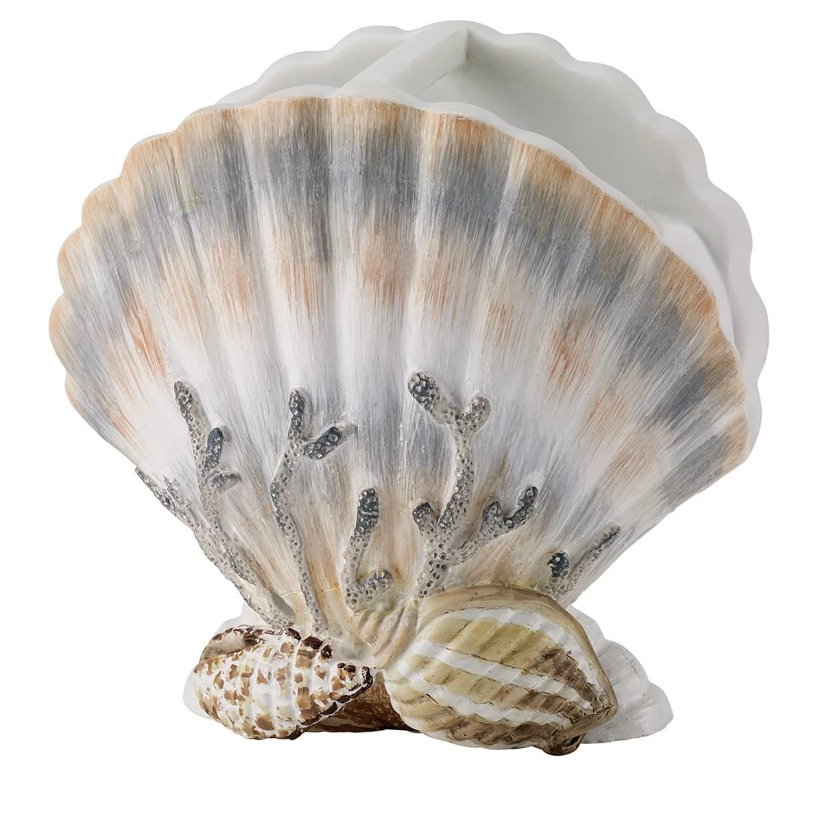 The Avanti Destin Toothbrush Holder features a figural fan shell with coral details, sitting on a shell base. This hand-painted piece will become the focal point of any bathroom setting with its unique design and elegant look.