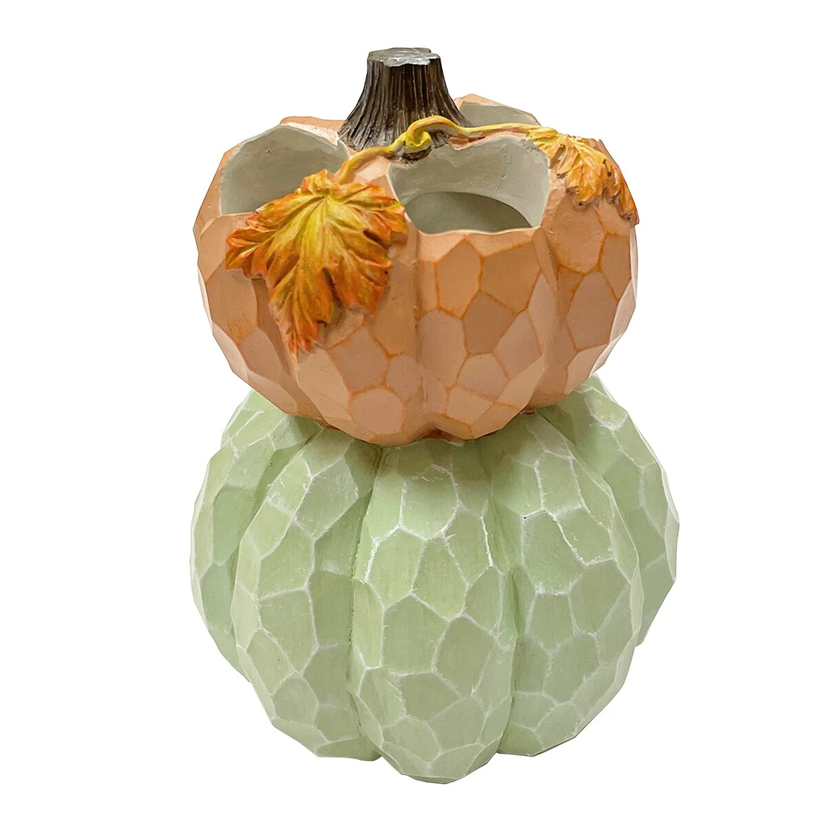 The Avanti Grateful Patch toothbrush holder features three stacked textured pumpkins in aqua and light orange. Made of durable, hand-painted resin that brings a touch of fall for any decor and any bathroom.
