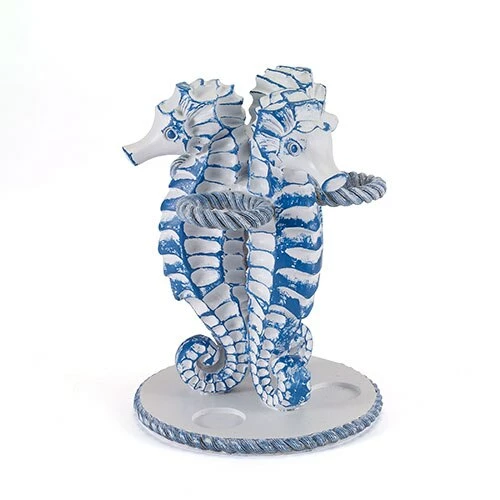The Avanti Island View toothbrush holder features a shell and starfish motif in shades of blues and beige on a white background. This intricately detailed piece is finished with a coordinating vertical striped border. Wipe with a damp cloth to clean. Dimensions: 5.12โH x 4.21โW x 4.21โD.