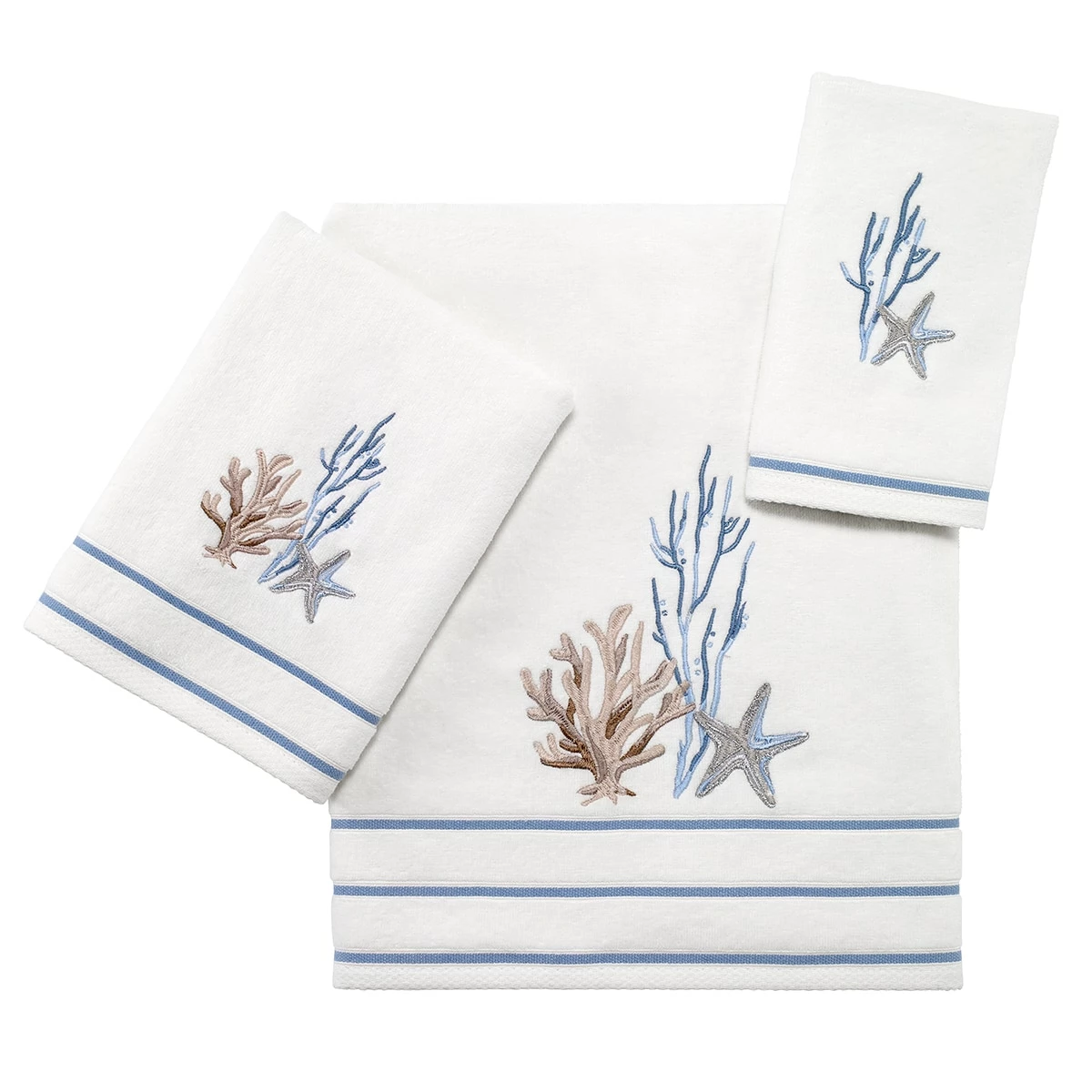 This Avanti abstract coastal bath towel collection features beautiful embroidered corals in blue and beige, along with a starfish and a decorative end hem completes the look.