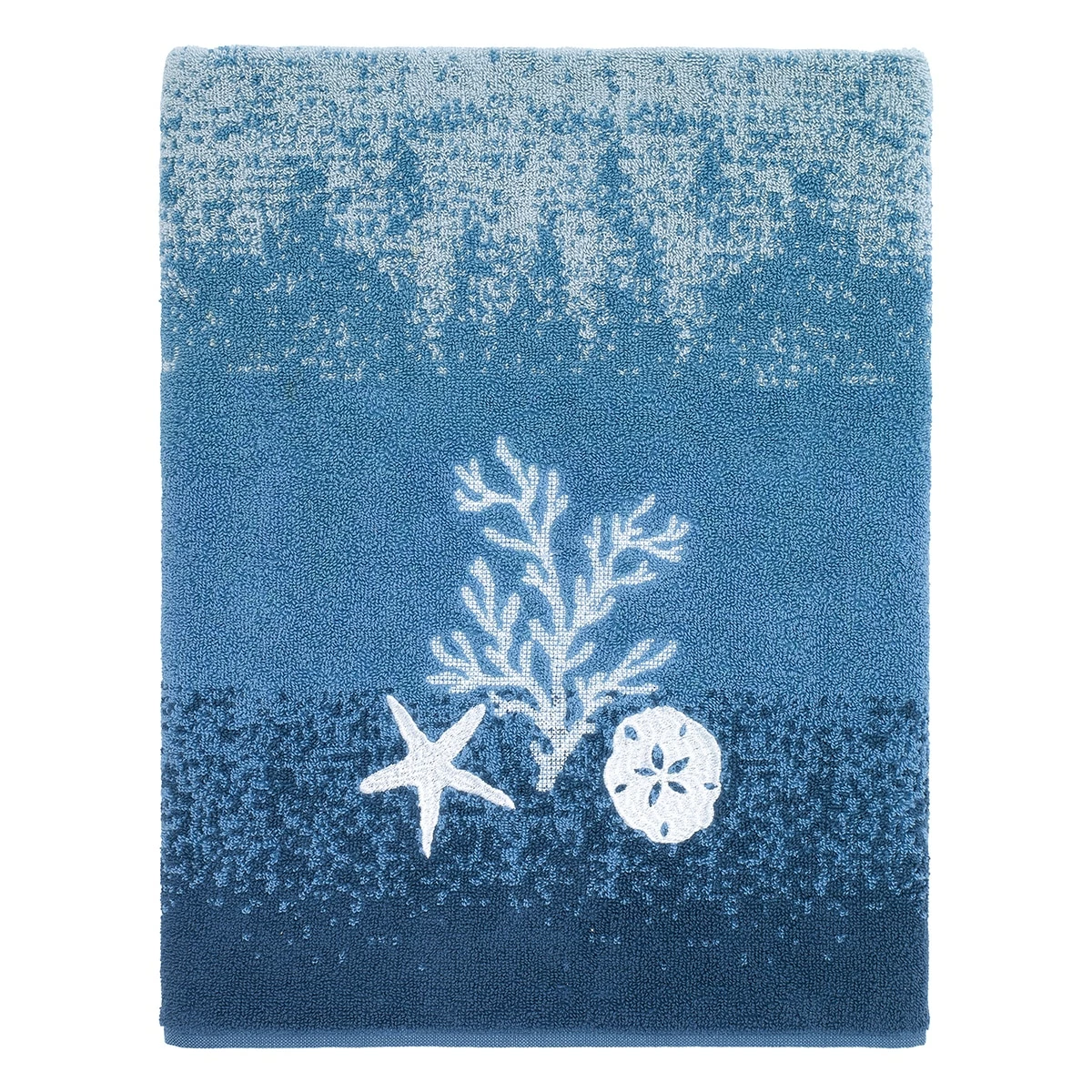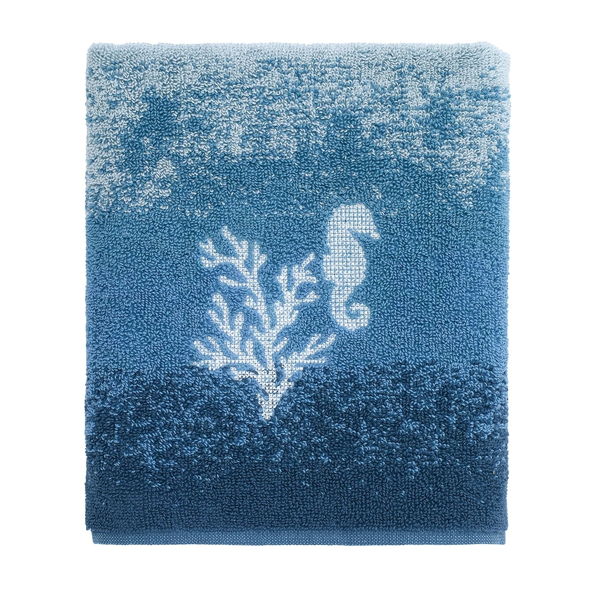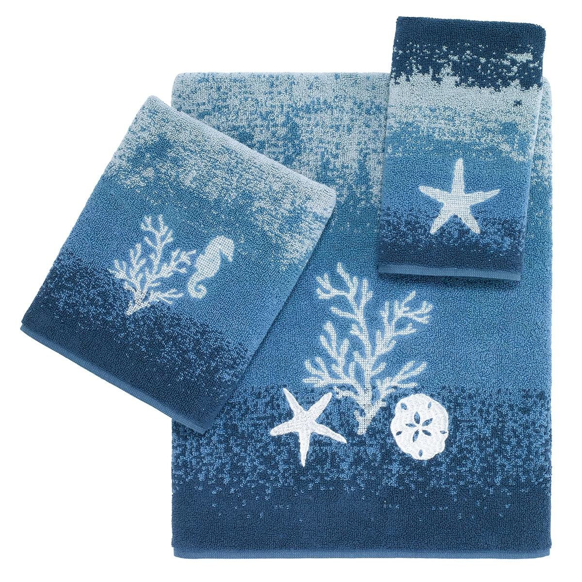 The Avanti Batik Coastal bath towel collection is decorated with embroidered ocean icons-coral, starfish, sand dollars on an ombre navy blue-to-white jacquard ground.