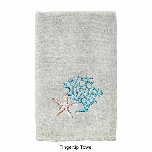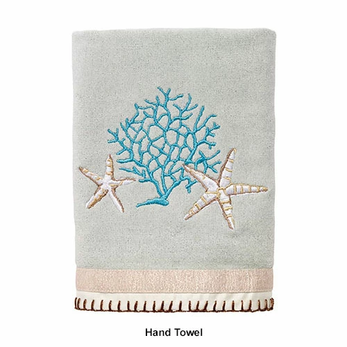 The Avanti Beachcomber towel collection features a beautifully embroidered seascape with starfish and coral. The towels are finished with a coordinating fabric border with a whip-stitch embroidered detail. 100% Cotton. Machine wash and tumble dry low.