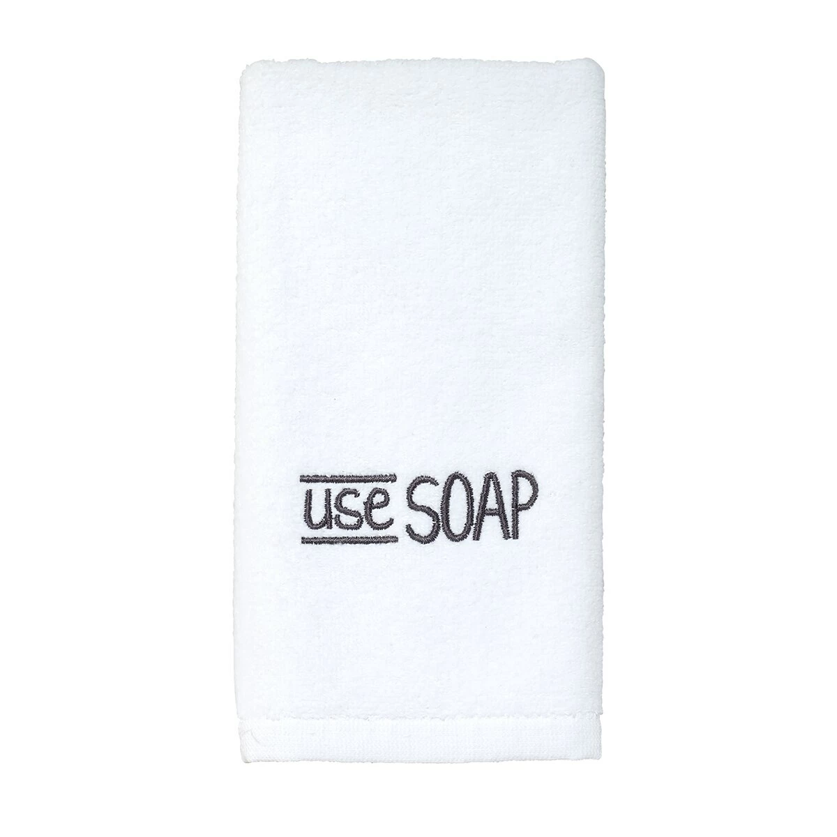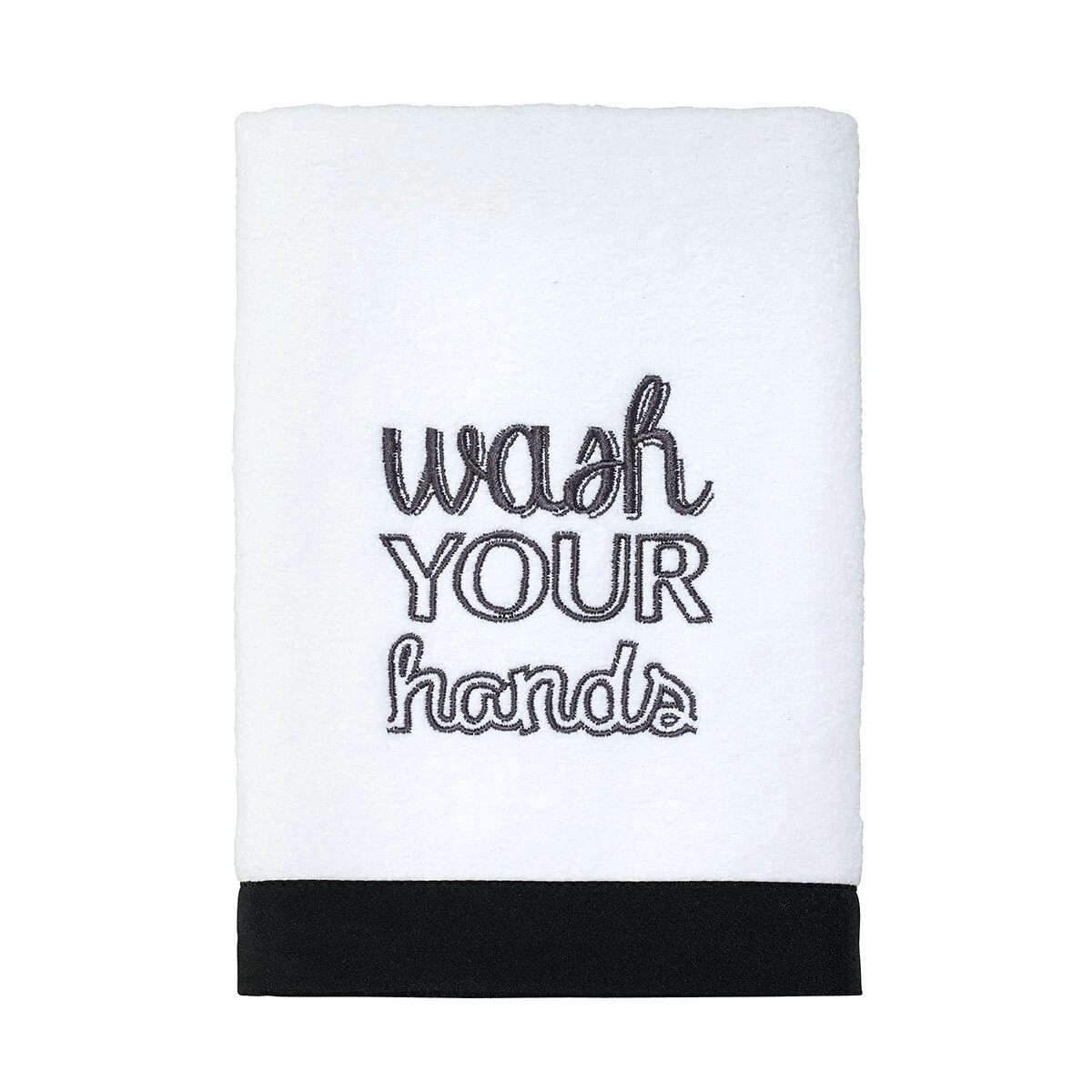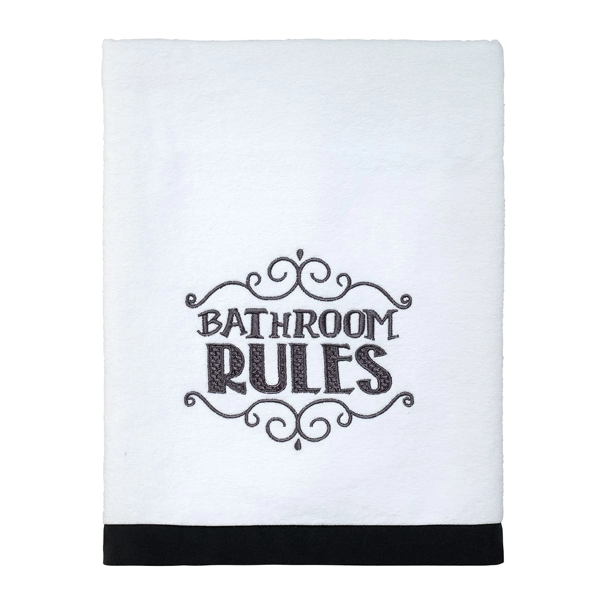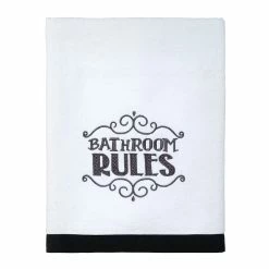 This Avanti chalk it up bath towel collection features an embroidered, “bathroom rules” in a playful black font. A coordinating black fabric border finishes the look.