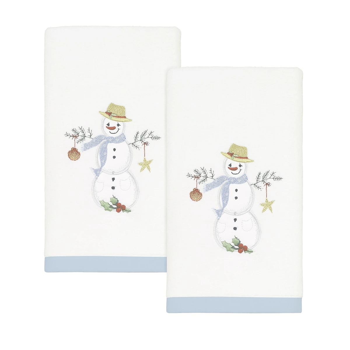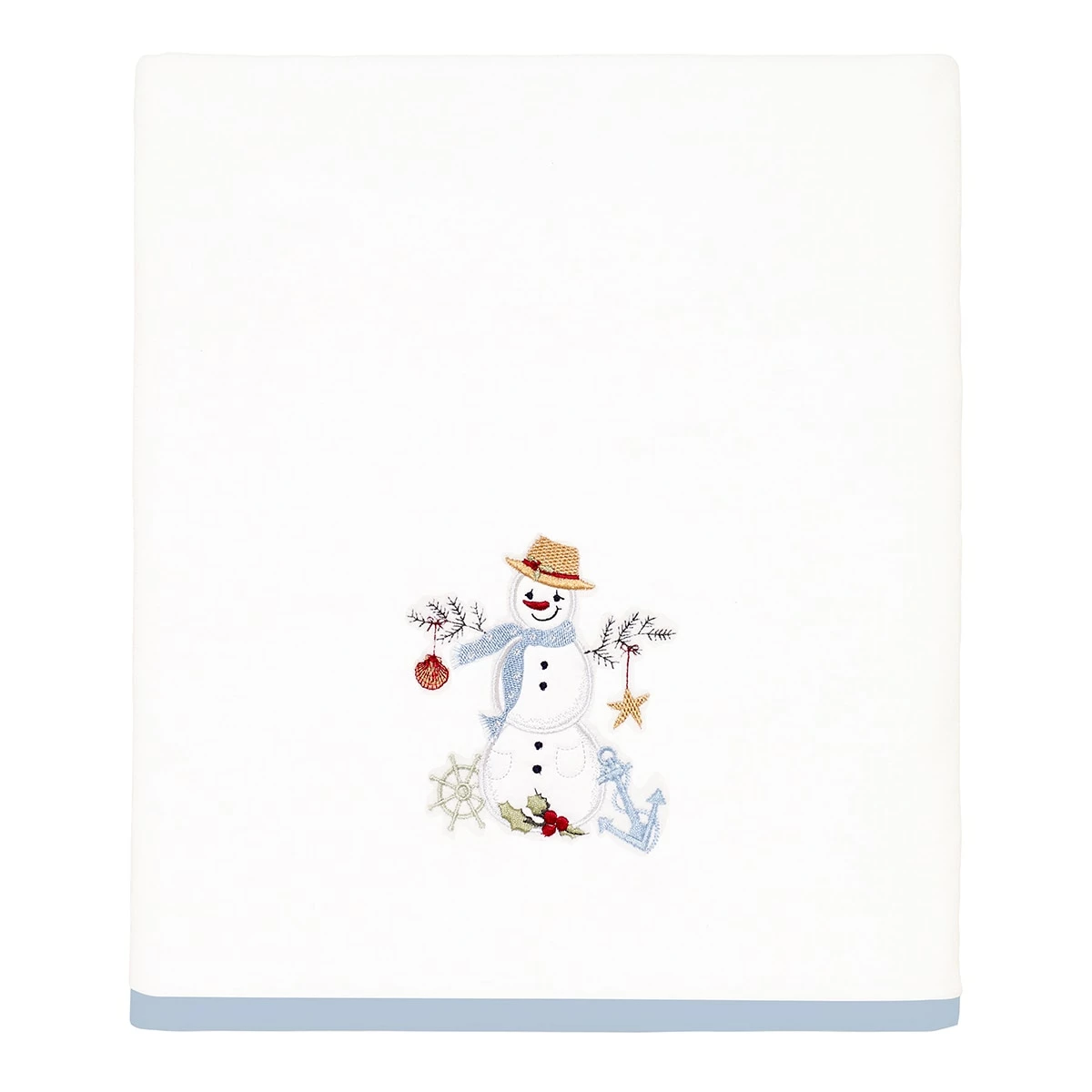 The Avanti Coastal Snowman bath towel collection features an embroidered smiling snowman with a straw hat, blue polka-dotted scarf, coastal scene. The cotton white velour towel piece is finished with a coordinating light blue polyester border. The fingertip towels come in a set of two.