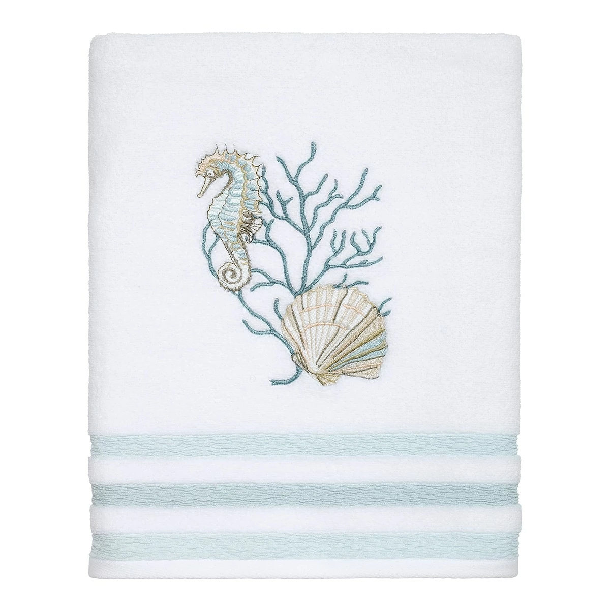 Add the Avanti Coastal Terrazzo bath towel collection to your bathroom decor. Each towel features an embroidered seahorse, fan shell, and coral in shades of blue and tan on a white terry towel with woven blue stripes.