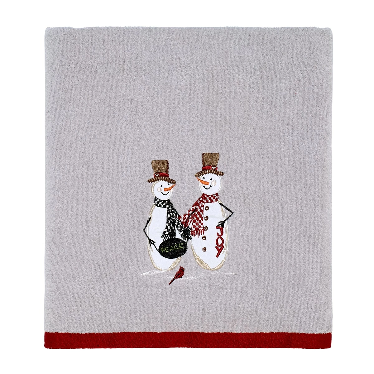 The Avanti Country Friends decorative bath towel features 2 embroidered happy snowmen with a colorful cardinal on a cotton light grey velour towel with a coordinating red polyester border.