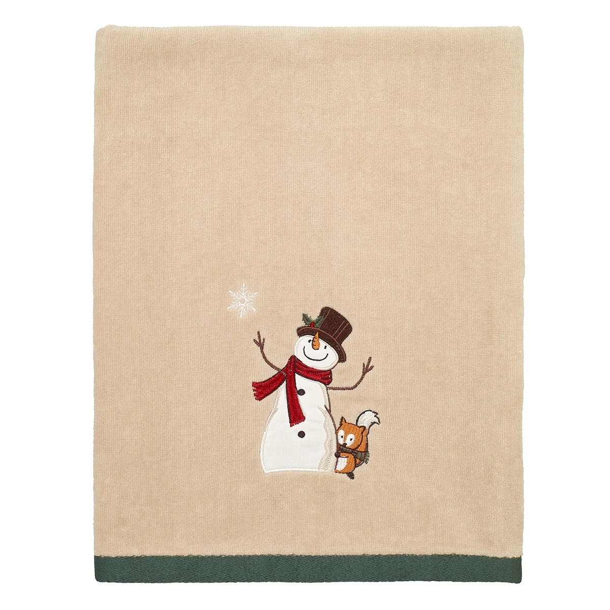 The Avanti Friends Gather decorative bath towel is embroidered with a happy snowman with a red scarf and top hat, accompanied by a friendly red fox. A coordinating green border adds the perfect finishing touch.