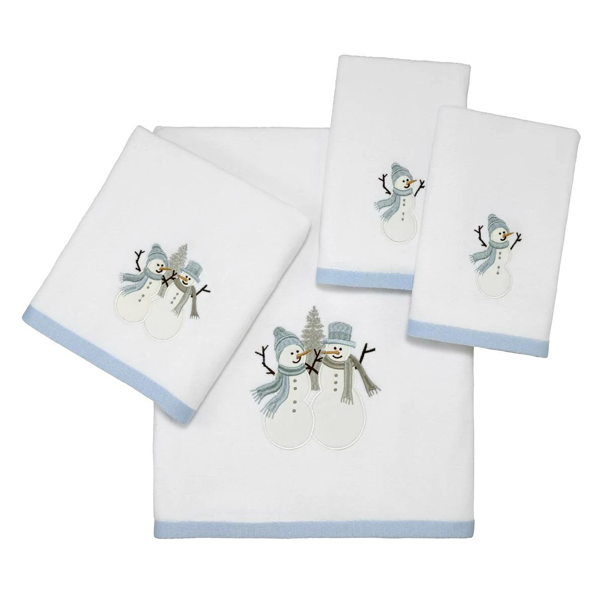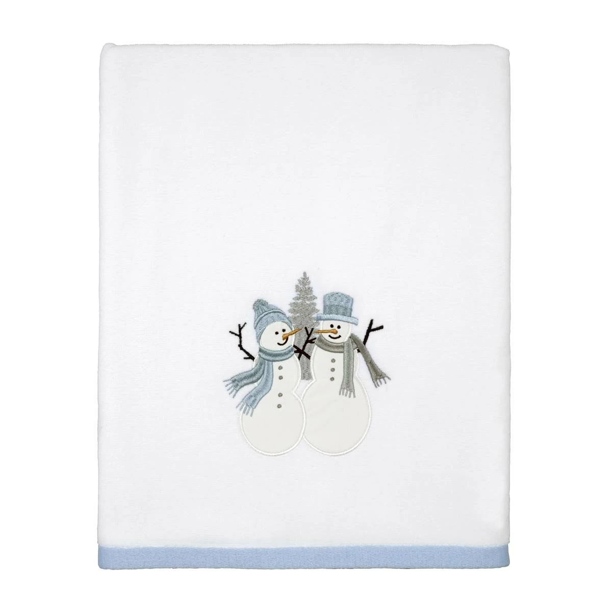 The Avanti Frosty Friends Decorative Bath Towel features two embroidered happy snowmen with blue hats and one with a grey scarf and the other with blue on white bodies. A grey pine tree sits in the background.