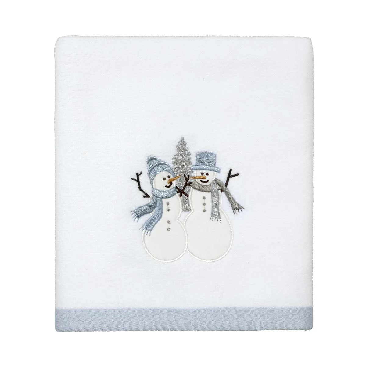 The Avanti Frosty Friends Decorative Hand Towel features two embroidered happy snowmen with blue hats and one with a grey scarf and the other with blue on white bodies. A grey pine tree sits in the background.