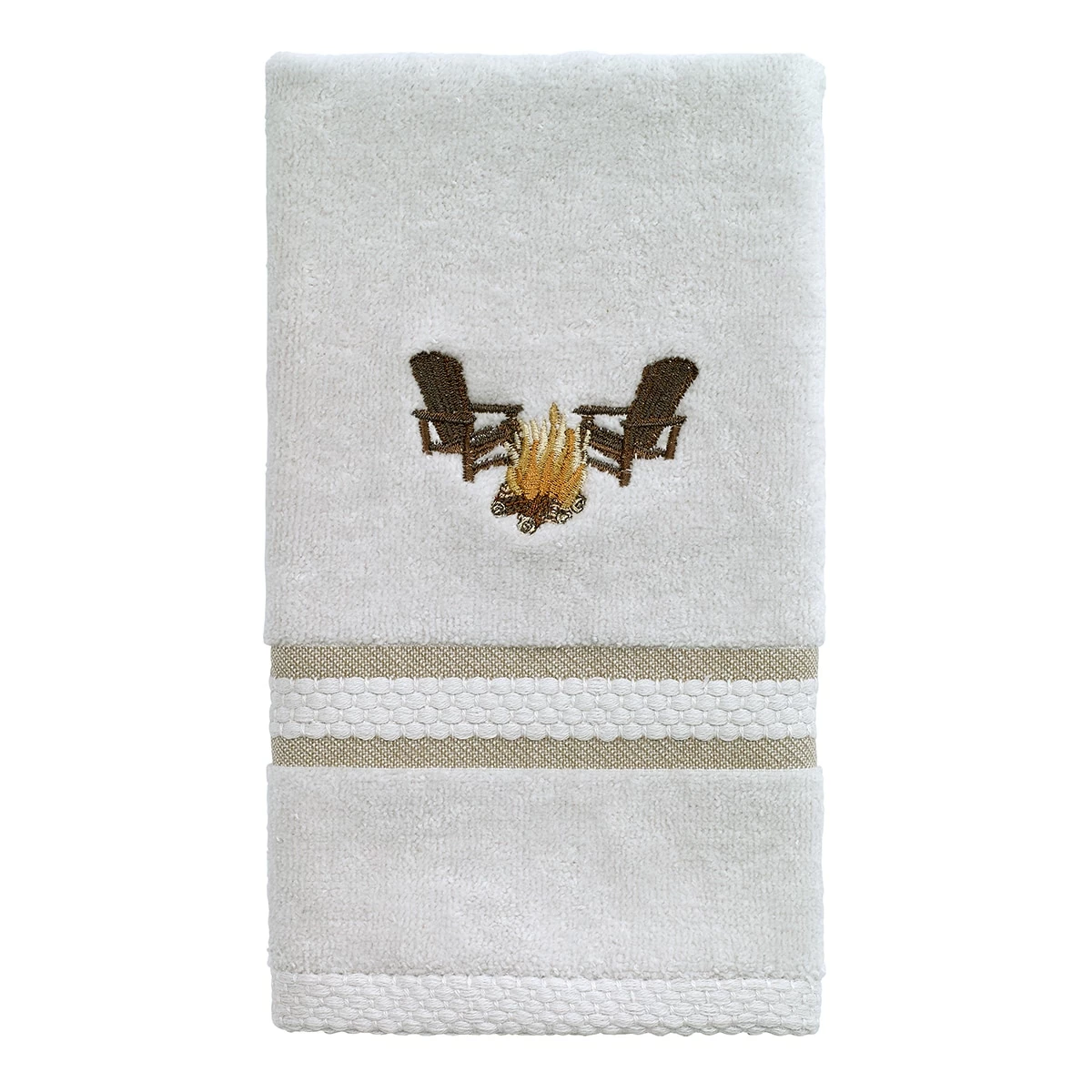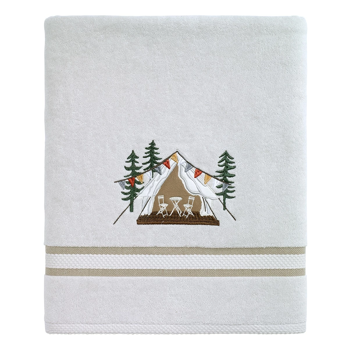 The Avanti Gone Glamping bath towel collection features various embroidered camping scenes with a tent, vintage camper, green pine trees, and Adirondack chairs around a campfire in beiges and white on a beige background.