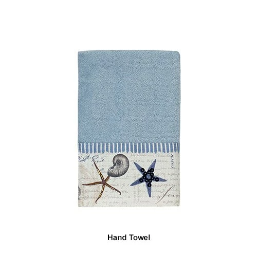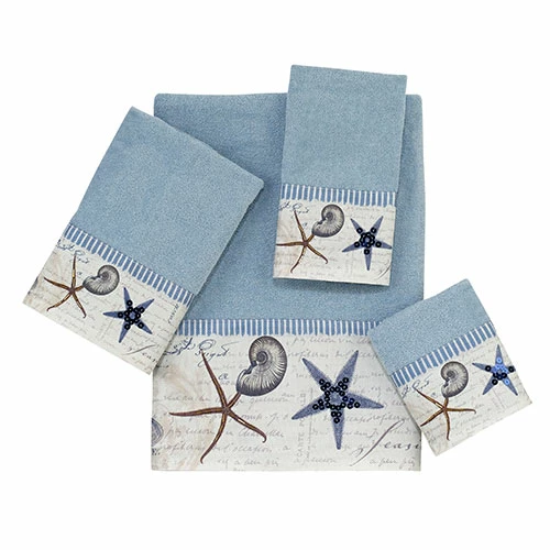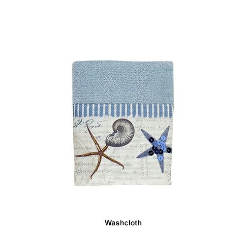 The Avanti Linens Antigua towel collection showcases a combination of sea creatures, ships, lighthouses and words on the background of a blue fog towel. The printed border features sequins with blue and white stripes. This set would make a great update to any beach bath dΓ©cor. 100% Cotton exclusive of embellishment. Machine wash warm, gentle cycle, tumble dry low. Dry cleaning recommended.Limited Manufacturer’s Warranty.