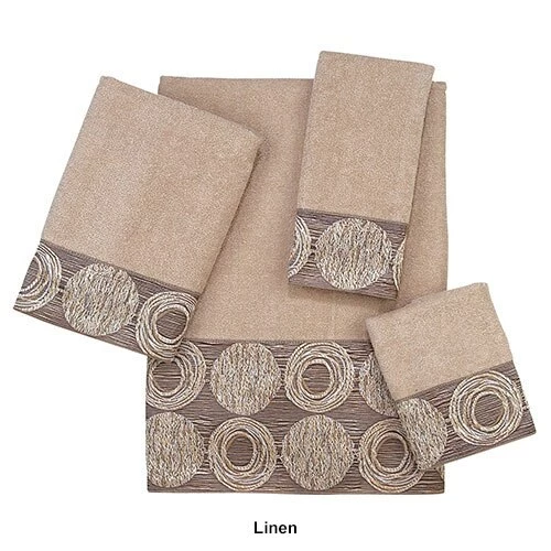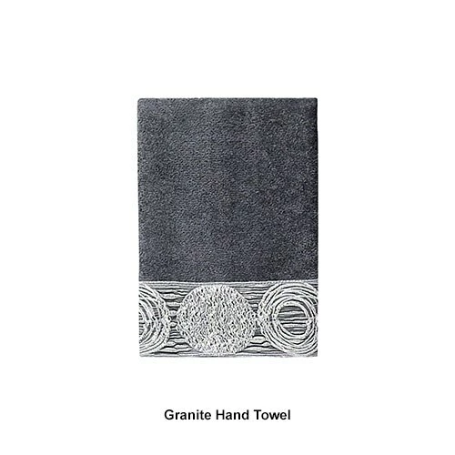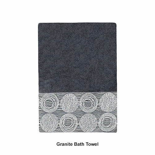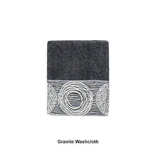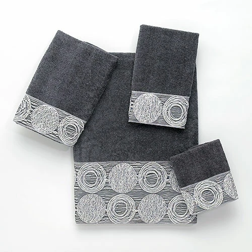The Avanti Linens Galaxy towel collection showcases a fun irregular circle design in shades of silver and grey on a solid granite or linen colored towel. The border features a metallic color that would make a great update to any bath dΓ©cor. 100% Cotton exclusive of embellishment. Machine wash warm, gentle cycle, tumble dry low. Dry cleaning recommended.Limited Manufacturer’s Warranty.